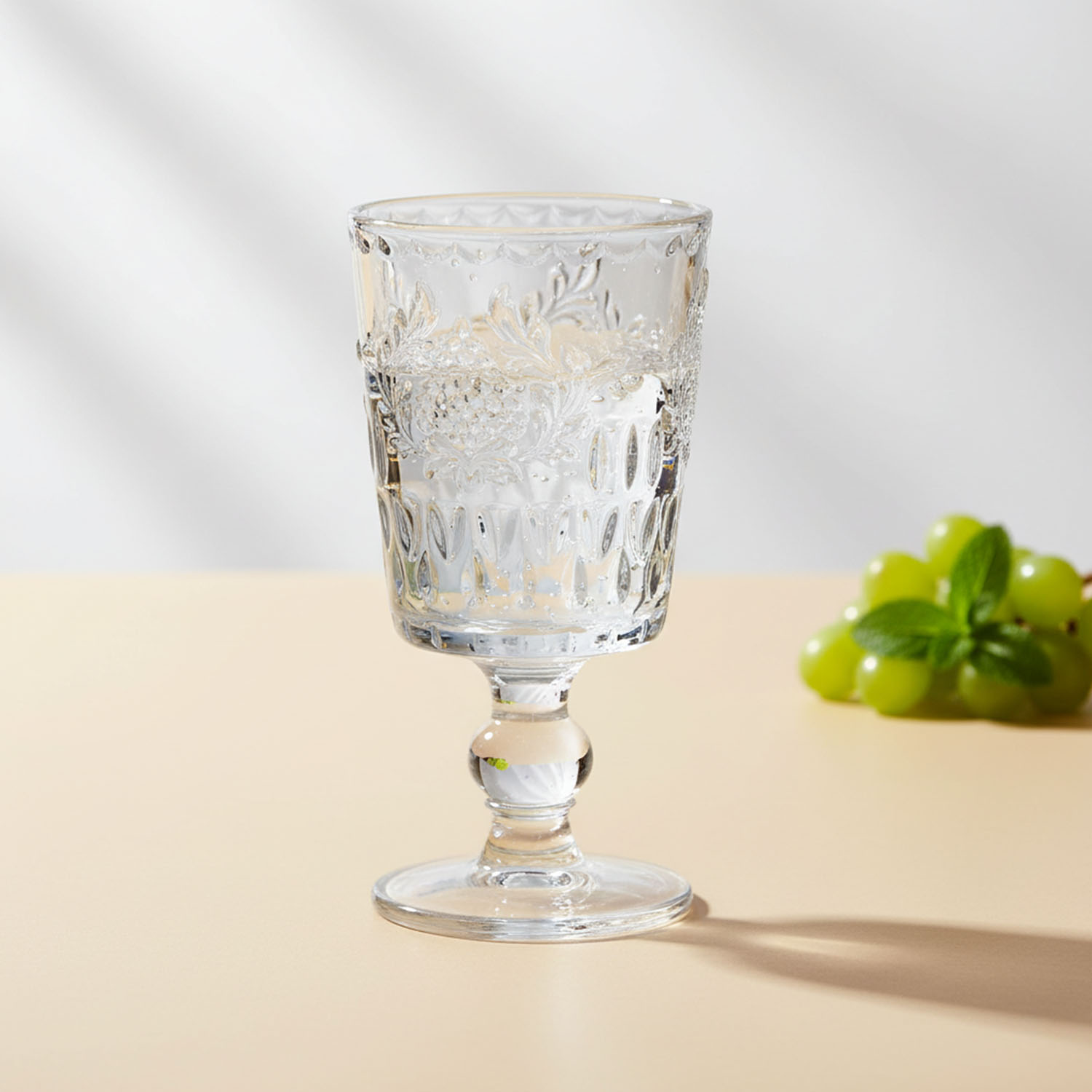Kadehler, klasik ve zamansız şeffaf renktedir. Kadeh kısmı kabartmalı ve dokulu bir yüzeye sahipken, ince ve zarif ayak detayı sunuma şıklık ve yükseklik katar. Dokulu yüzey, ışığı kırarak kadehe parlaklık ve derinlik katar.