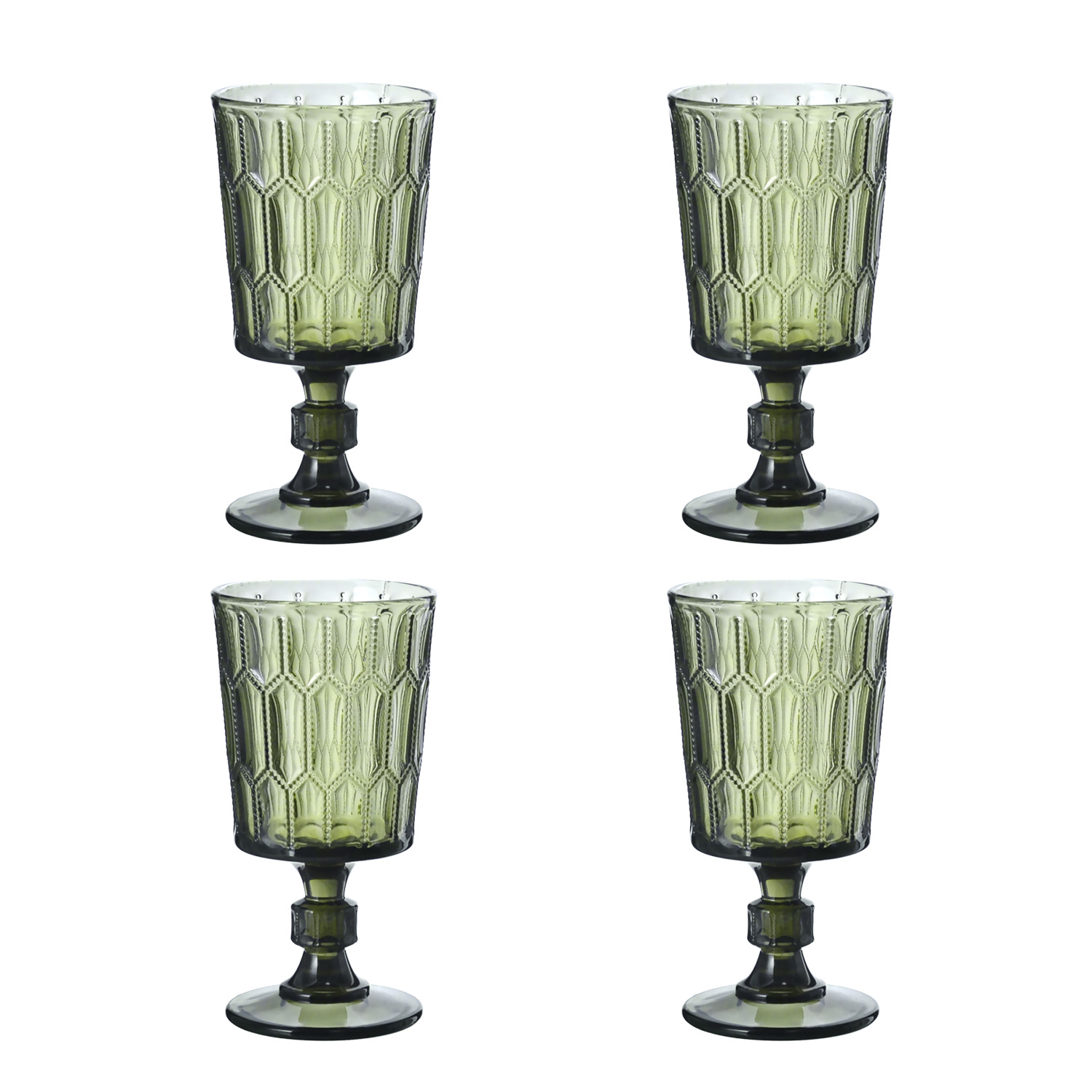 ALMERA 4’lü Cam Kadeh Seti, 330 cc hacmi ve yeşilin doğal tonuyla sofranıza taze ve asil bir hava katıyor. Kabartmalı yüzeyi ve zarif ayaklı tasarımı sayesinde, su, şarap veya kokteyl sunumlarınızı estetik bir keyfe dönüştürür.