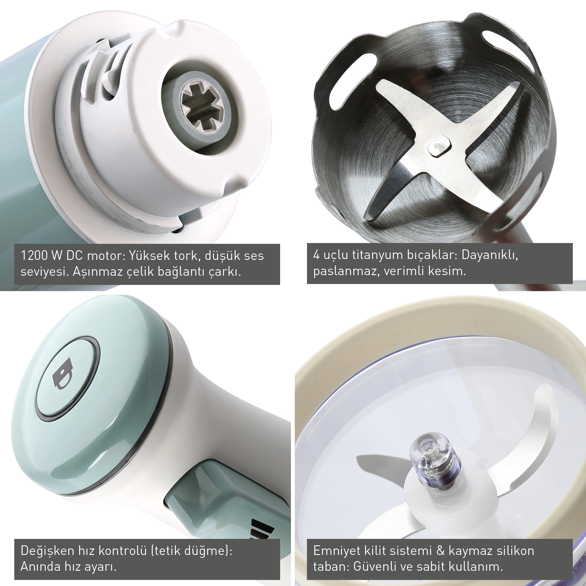 Düşük gürültü, yüksek performans! Güçlü DC motoru, değişken hız kontrolü ve çok yönlü aksesuarlarıyla mutfakta tüm işlemler için ideal.Öne Çıkan Özellikler:
