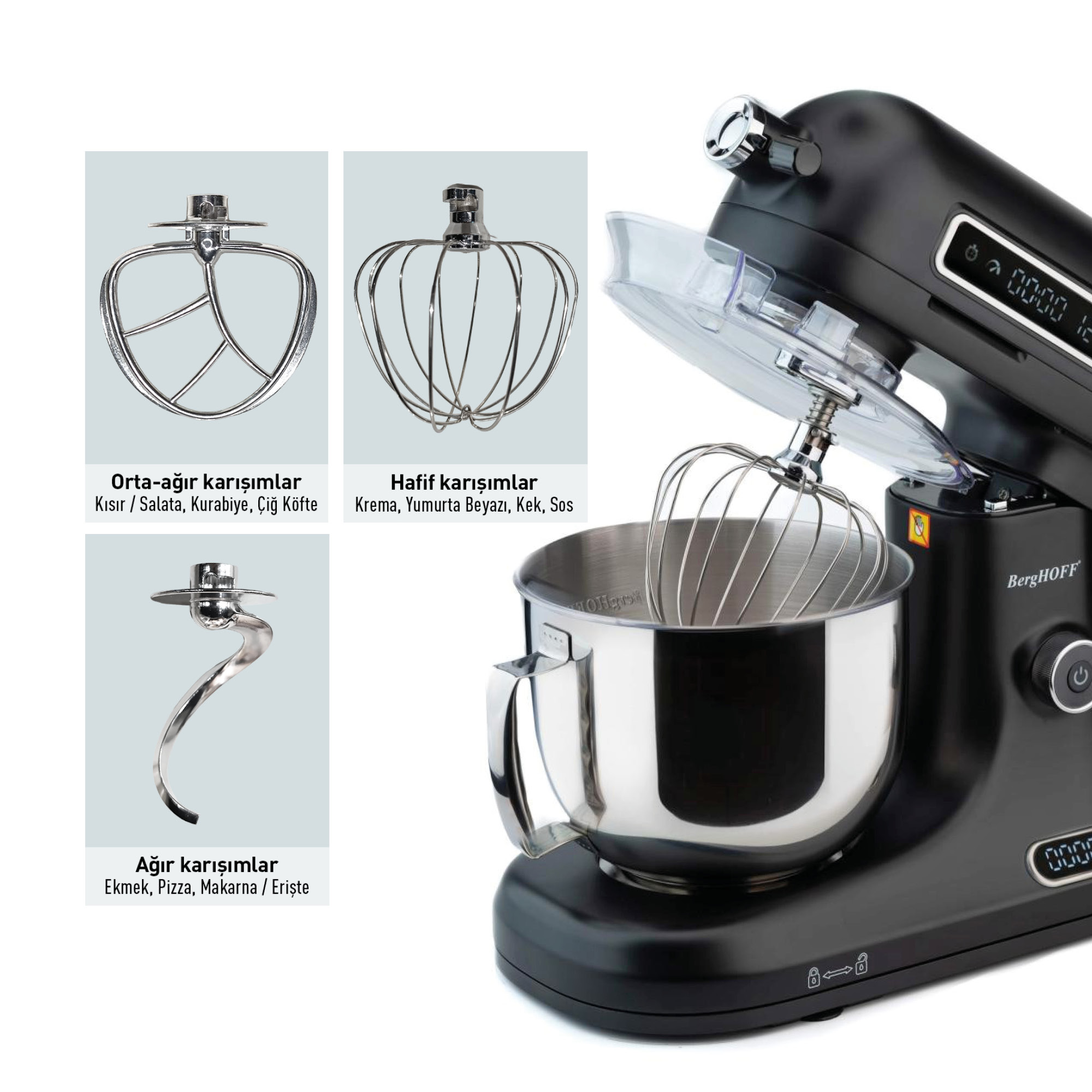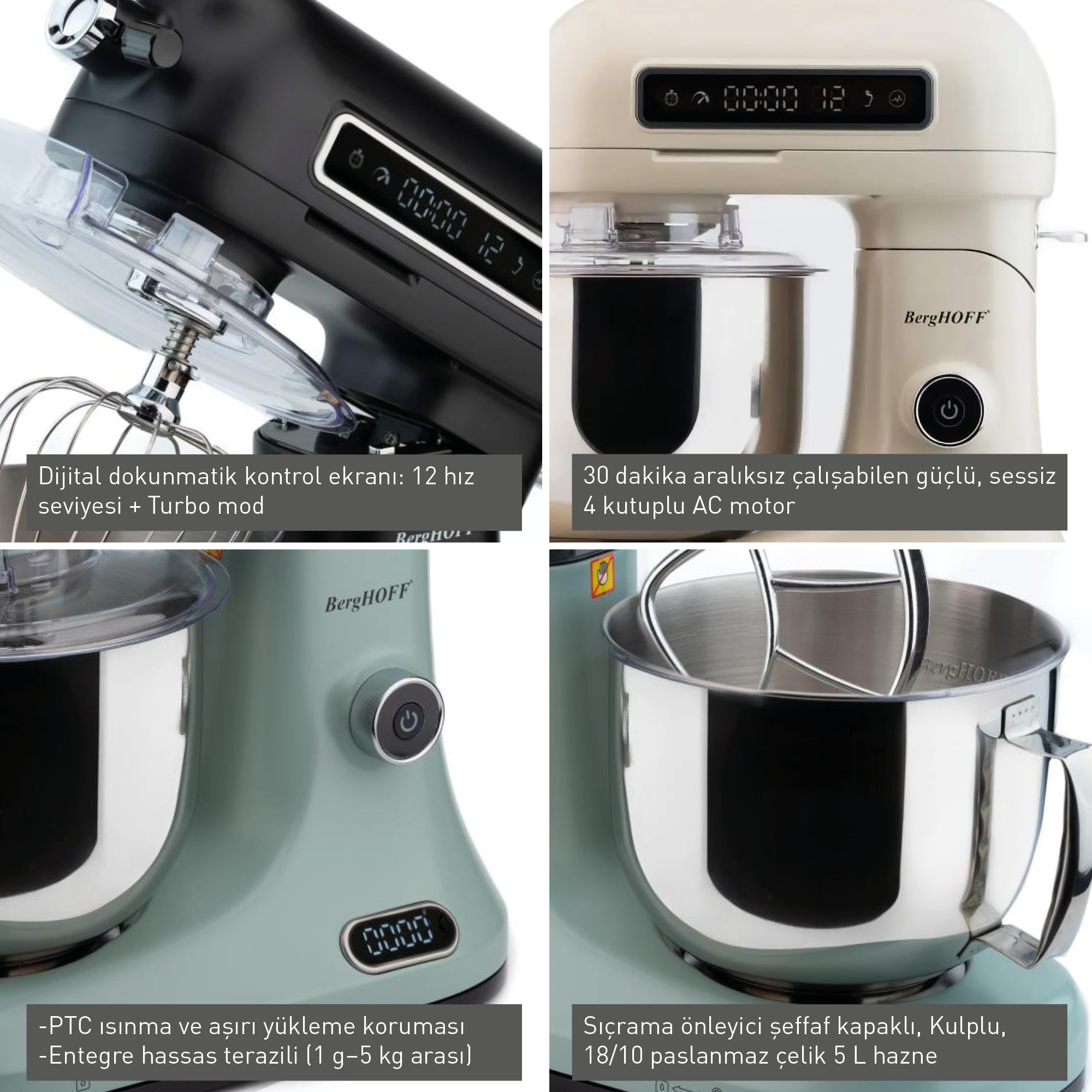 Profesyonel performans mutfağınızda! 1600W güçlü AC motoru ve entegre dijital terazisi ile Berghoff Stand Mikser, kusursuz sonuçlar için tasarlandı. Hamurdan kek karışımına kadar her aşamada ideal kıvamı yakalamanıza yardımcı olur. Dokunmatik ekranıyla hız, süre ve turbo fonksiyonlarını zahmetsizce kontrol edebilirsiniz.Öne Çıkan Özellikler: