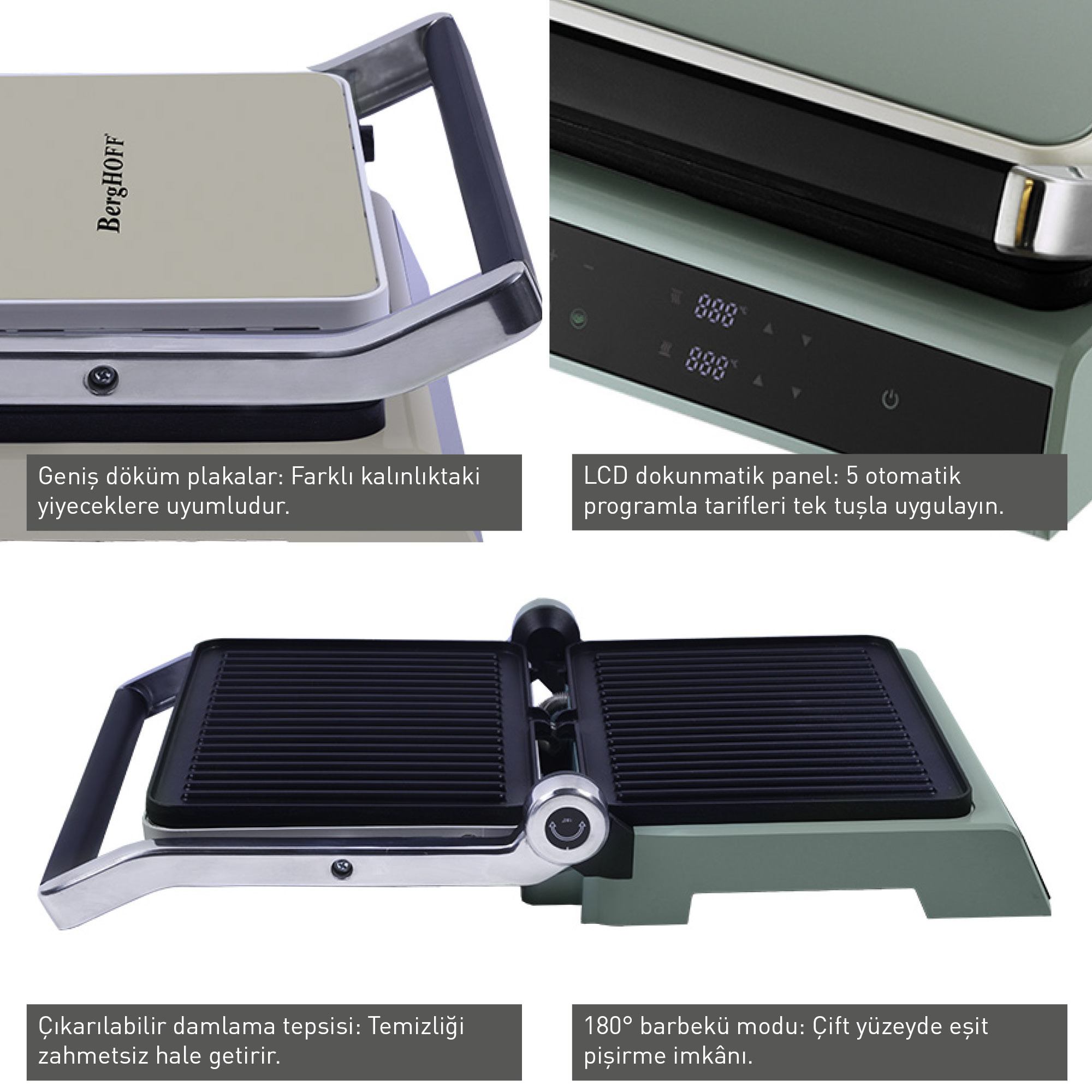 Yemek hazırlamayı keyfe dönüştüren Berghoff LCD Kontrollü Izgara ve Tost Makinesi, mint yeşili şık tasarımı ve teknolojik donanımıyla mutfağınıza yeni bir soluk getiriyor. 1800-2000W arası gücüyle güçlü performans sunan bu cihaz, ister tost ister barbekü pişirme ihtiyacınızda yanınızda.LCD kontrol paneli ile plakaların sıcaklık ayarı yapılabilirken, 5 otomatik program ve manuel mod sayesinde kişisel pişirme tercihleriniz kolayca uygulanabilir. 290×212 mm yapışmaz döküm plakalar, her iki yüzeyde eşit ve lezzetli pişirme sağlar. Çıkarılabilir damlama tepsisi ve ısıyı iletmeyen dayanıklı kol ise kullanım kolaylığı sunar.