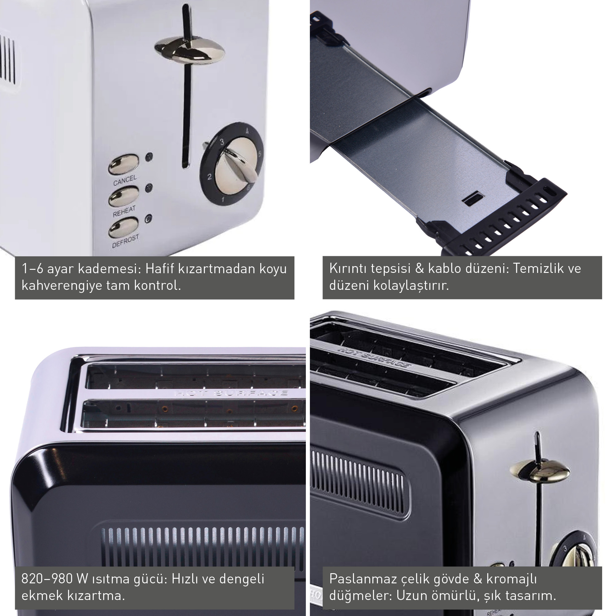Berghoff’un gold detaylı, modern tasarımıyla mutfağınıza şıklık katın! 2 dilim kapasitesi ve 820–980W arası ısıtma gücüyle ekmeklerinizi tam istediğiniz gibi kızartın.Paslanmaz çelik gövdesi ve 6 kademeli kızartma ayarı sayesinde her zevke hitap eder. Buz çözme, yeniden ısıtma ve iptal fonksiyonlarıyla ekstra kontrol sunar. Kırıntı tepsisi ve kablo sarma bölümü ile temiz ve düzenli kullanım sağlar.