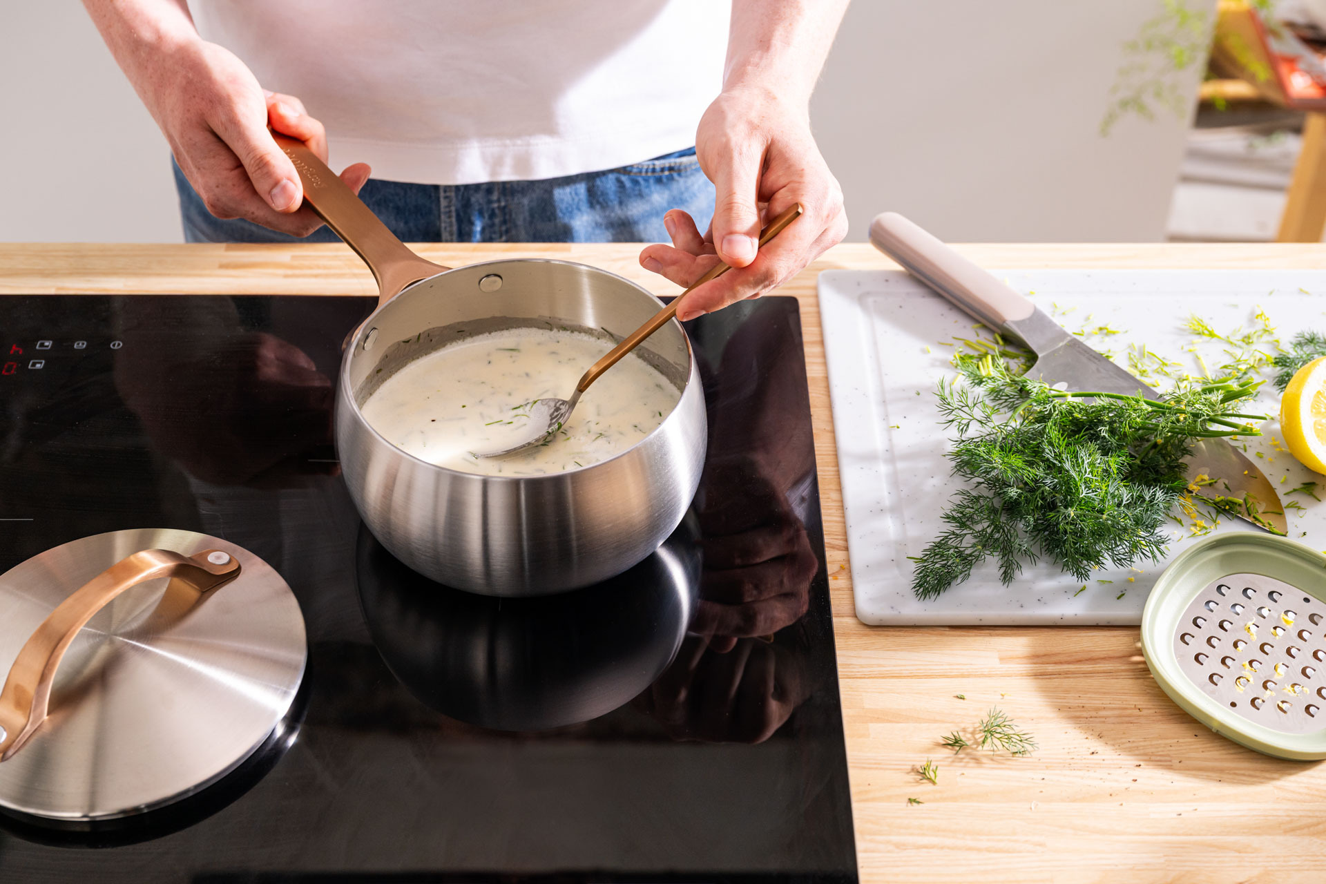 Set İçeriği: 1 adet sos tenceresi ve 1 adet uyumlu paslanmaz çelik kapak.