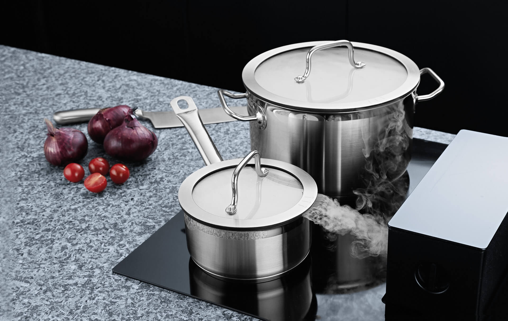 Profesyonel şeflerin tercihi Hotel Downdraft set, günlük mutfak ihtiyaçlarınızı karşılayacak 7 parçadan oluşur. Alt katmana eşit ısı transferi sağlayan tabanı, enerji verimliliğini maksimize eder. Paslanmaz çelik ağızlı cam kapaklar, silikon contasıyla buharı doğrudan aşağı yönlendirir ve kalıcı kokuları ortadan kaldırır. Ergonomik, ölçü işaretli iç hacim ve bulaşık makinesinde yıkanabilir yapısıyla konforlu kullanım sunar.