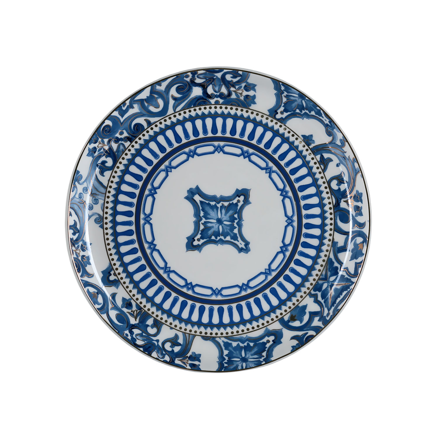 Tabaklar, yoğun mavi ve beyaz tonlarında, mandala veya iç içe geçmiş geometrik motiflerle süslenmiştir. Her bir tabak, merkezden kenara doğru yayılan deseniyle optik bir derinlik ve hareketlilik sunar. Setin içindeki farklı desenler, sunuma dinamizm katar.