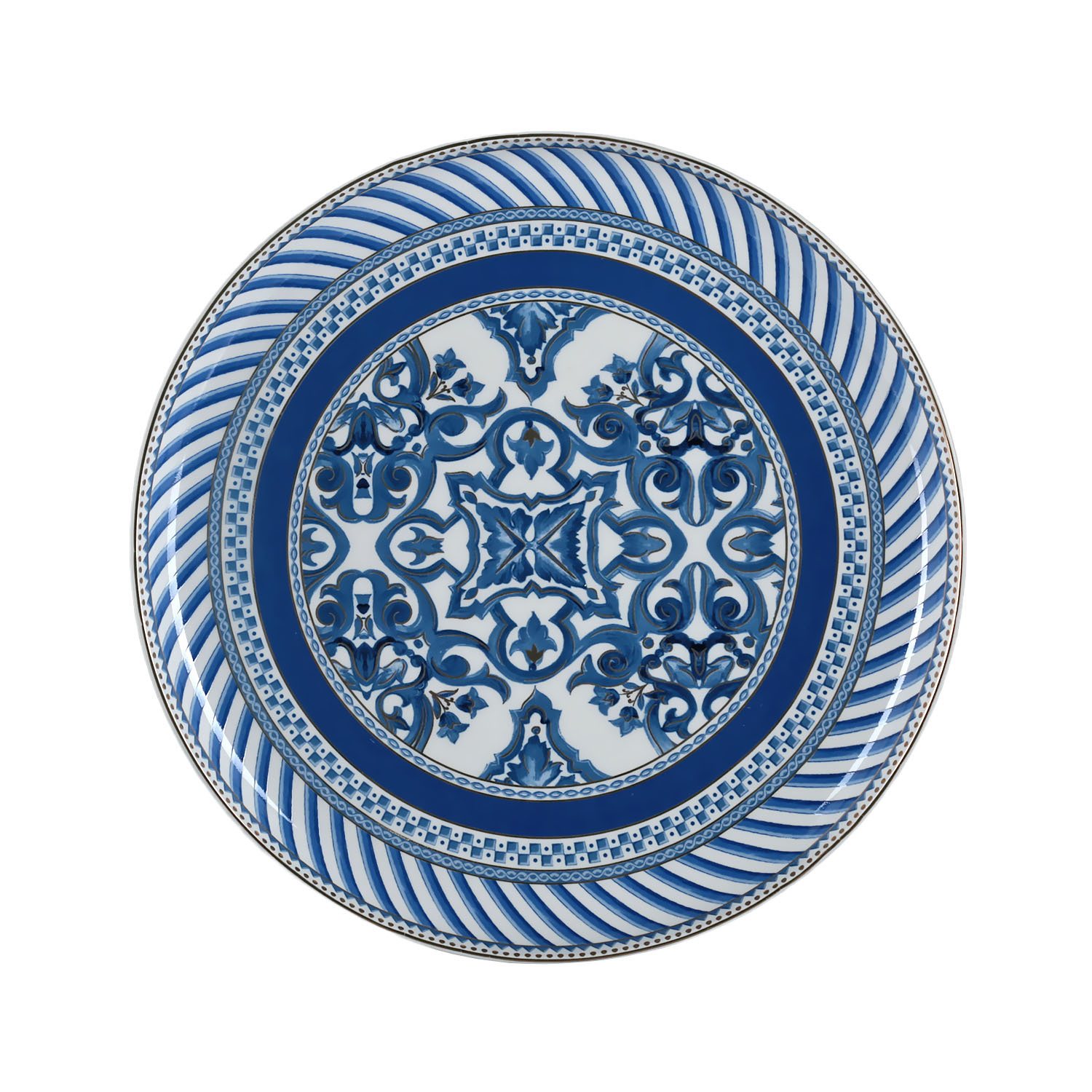 Tabaklar, yoğun mavi ve beyaz tonlarında, mandala veya iç içe geçmiş geometrik motiflerle süslenmiştir. Her bir tabak, merkezden kenara doğru yayılan deseniyle optik bir derinlik ve hareketlilik sunar. Setin içindeki farklı desenler, sunuma dinamizm katar.