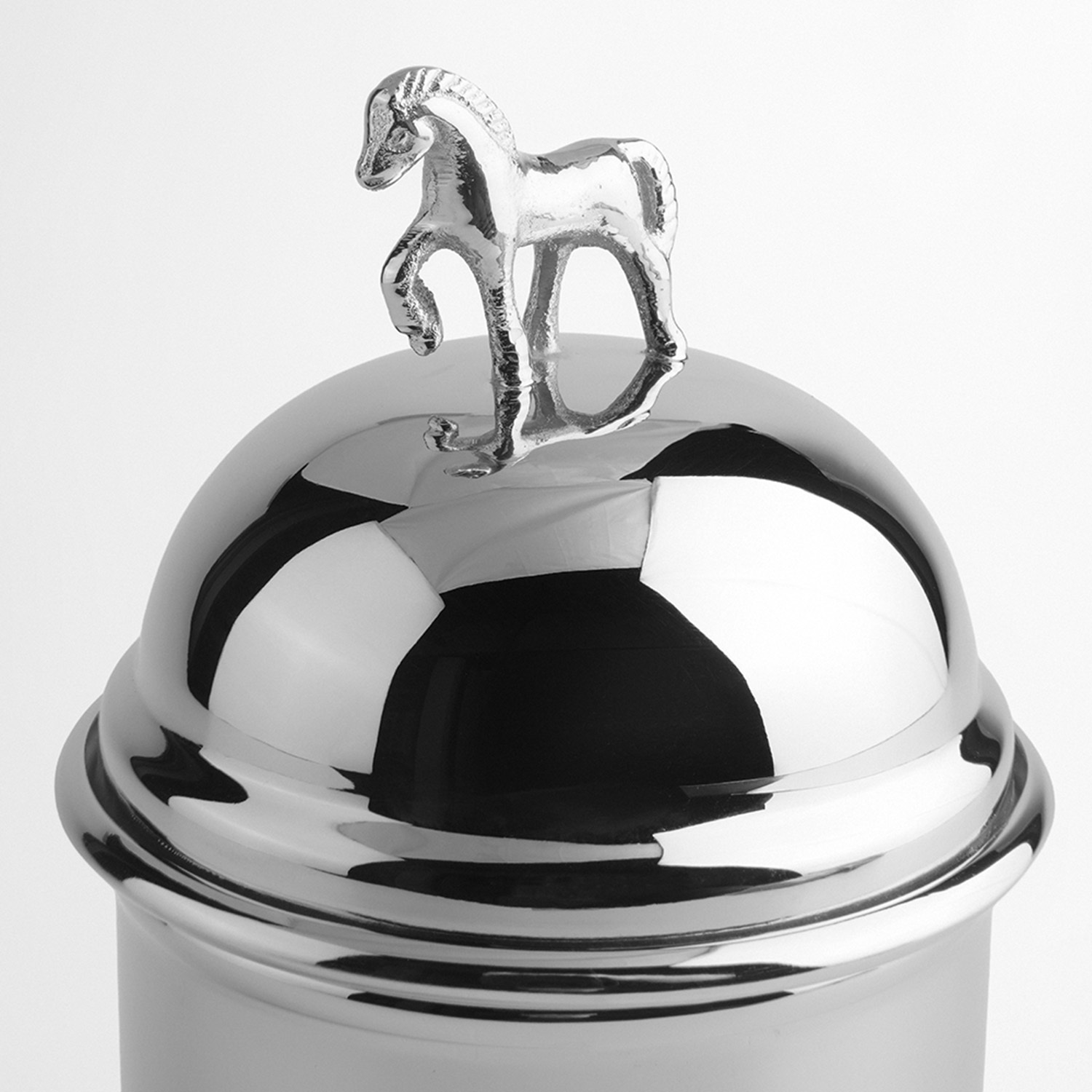 Paslanmaz çeliğin hijyenik ışıltısını asil bir at figürüyle buluşturan bu dekoratif kavanoz, serinin en kompakt üyesi olarak yaşam alanlarınızda zarif bir detay oluşturuyor. Küçük boyutlarına rağmen güçlü bir dekoratif duruşa sahip olan bu parça, hem klasik hem de modern mekanlara prestij katar.