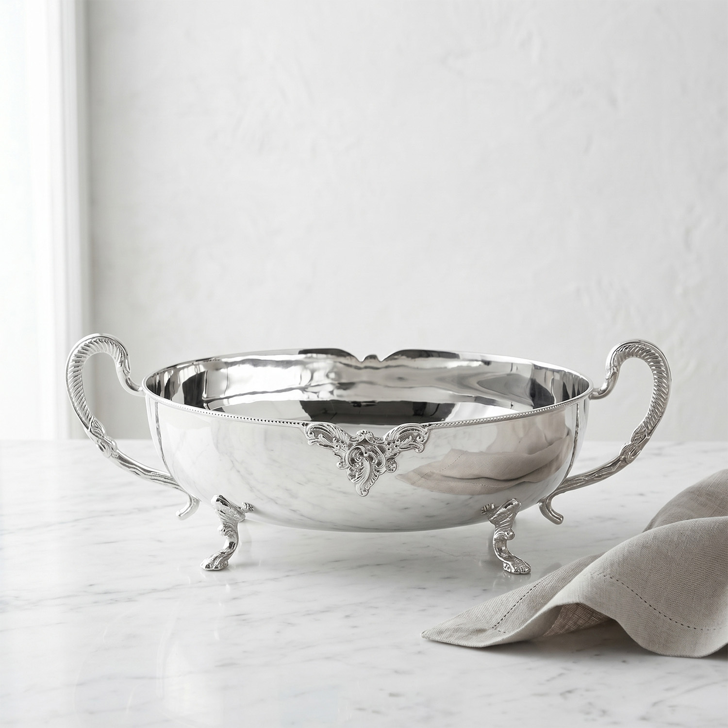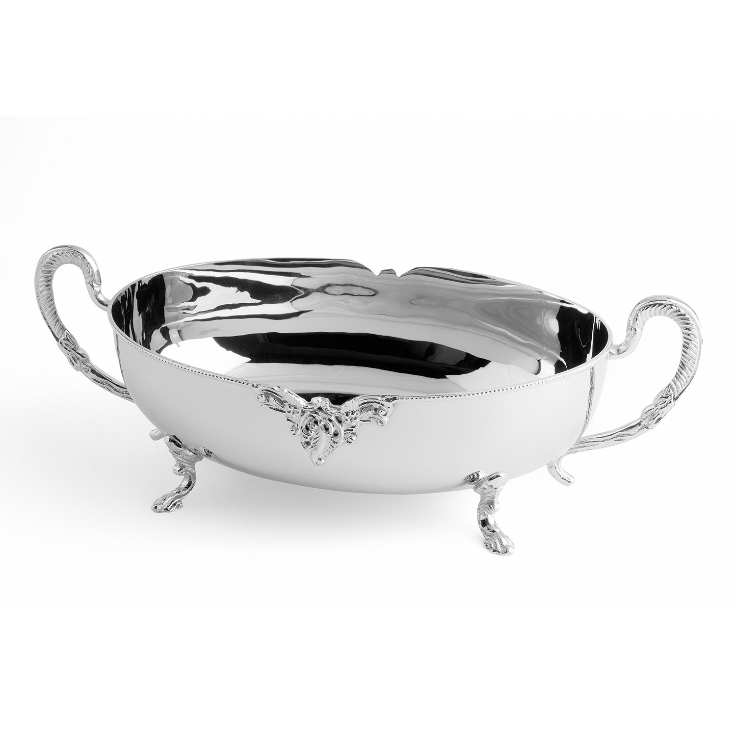 Paslanmaz çeliğin zamansız parıltısını klasik formlarla buluşturan bu elips kase, sunumlarınıza aristokratik bir zarafet katmak için tasarlandı. Yanlardaki kıvrımlı kulpları, gövde üzerindeki zarif kabartma motifleri ve asil pençe ayaklarıyla sofranızda parlayan bir sanat objesidir.
