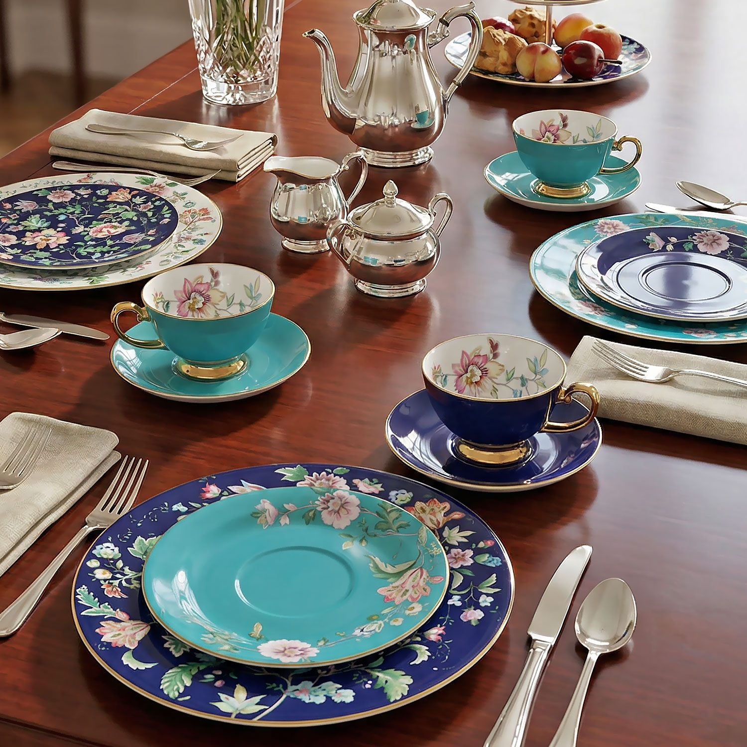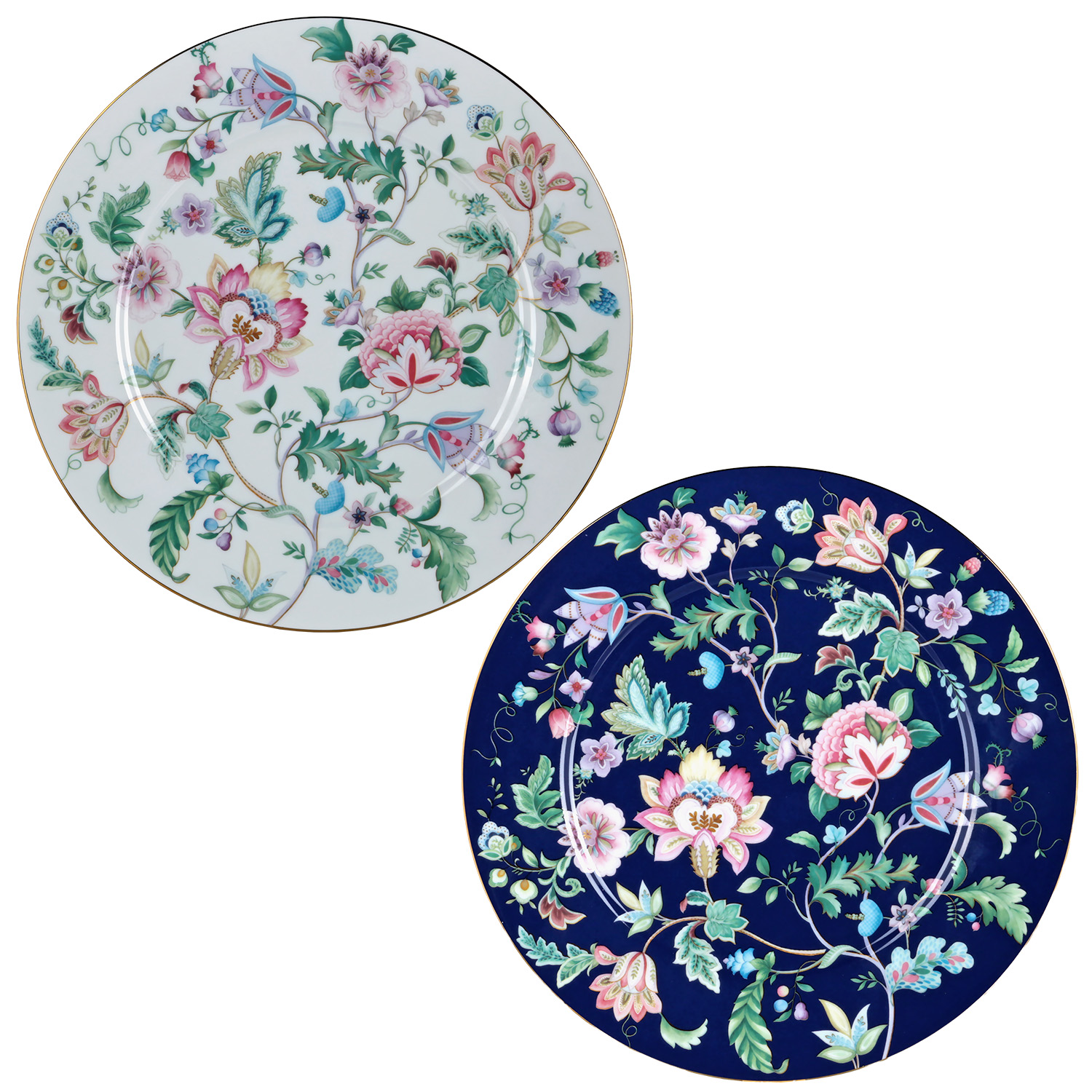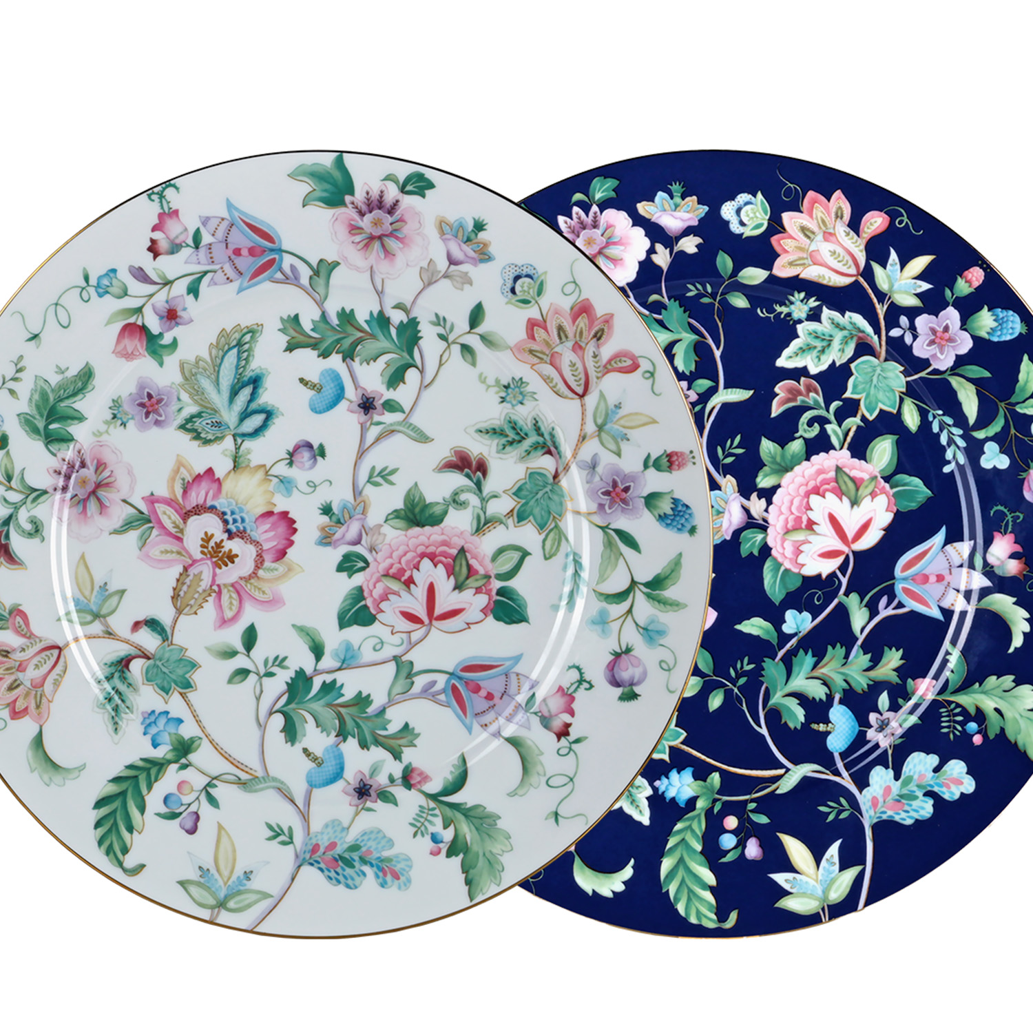Bir tabak saf beyaz zemin üzerine, diğeri ise derin saks mavisi zemin üzerine işlenmiş pembe, turkuaz ve lila tonlarındaki zengin çiçek dallarıyla bezenmiştir.