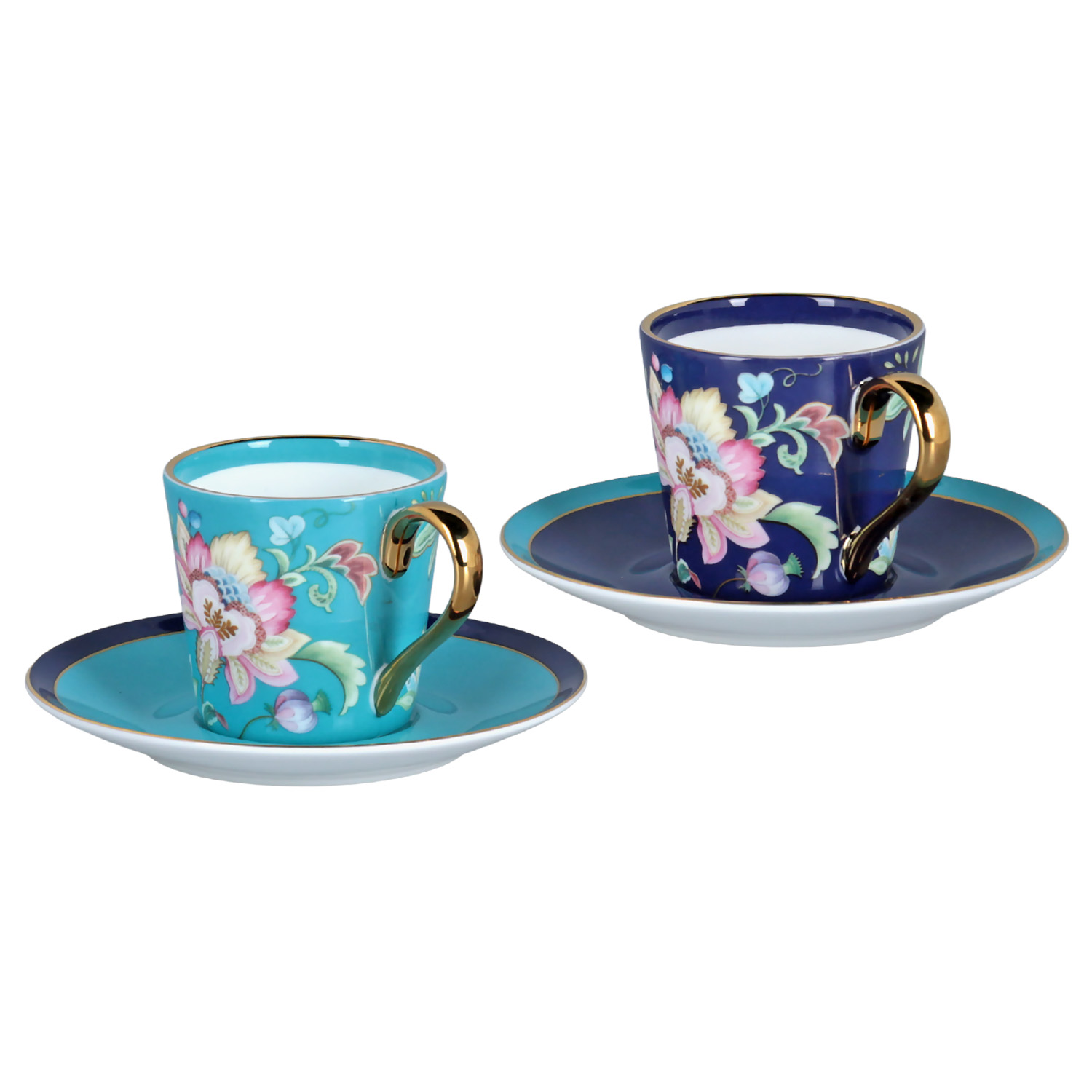 Bir fincan canlı turkuaz, diğeri ise derin saks mavisi zemin üzerine pembe ve altın sarısı floral motiflerle bezenmiştir.