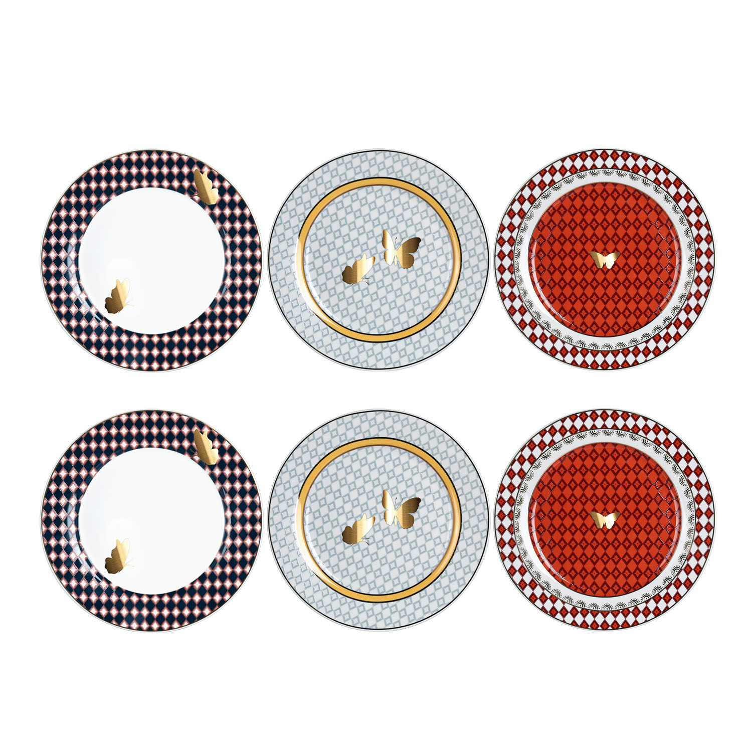 Set, farklı renk ve desen kombinasyonlarına sahip 3 çeşitten 2'şer adet tabak içerir: