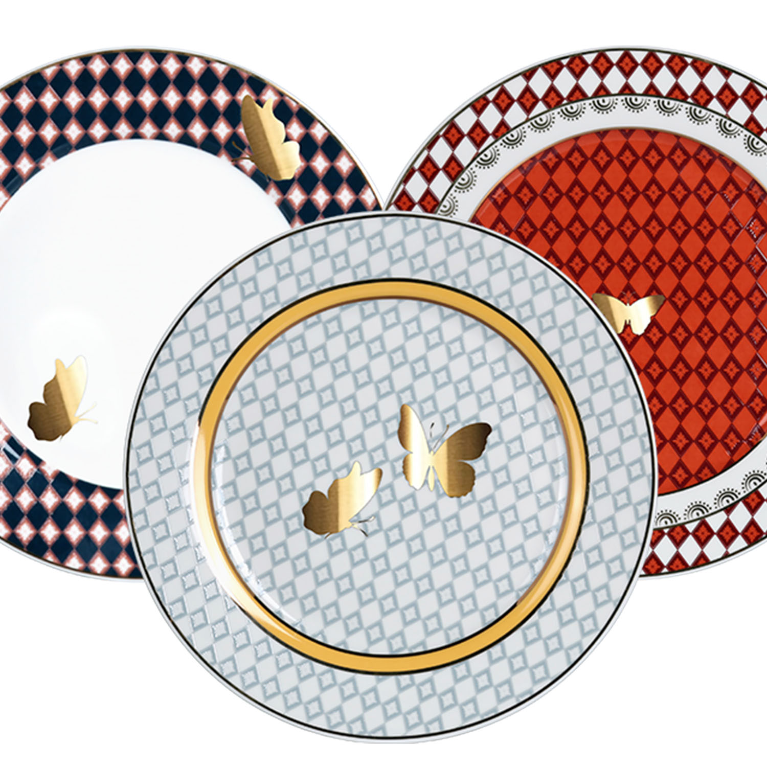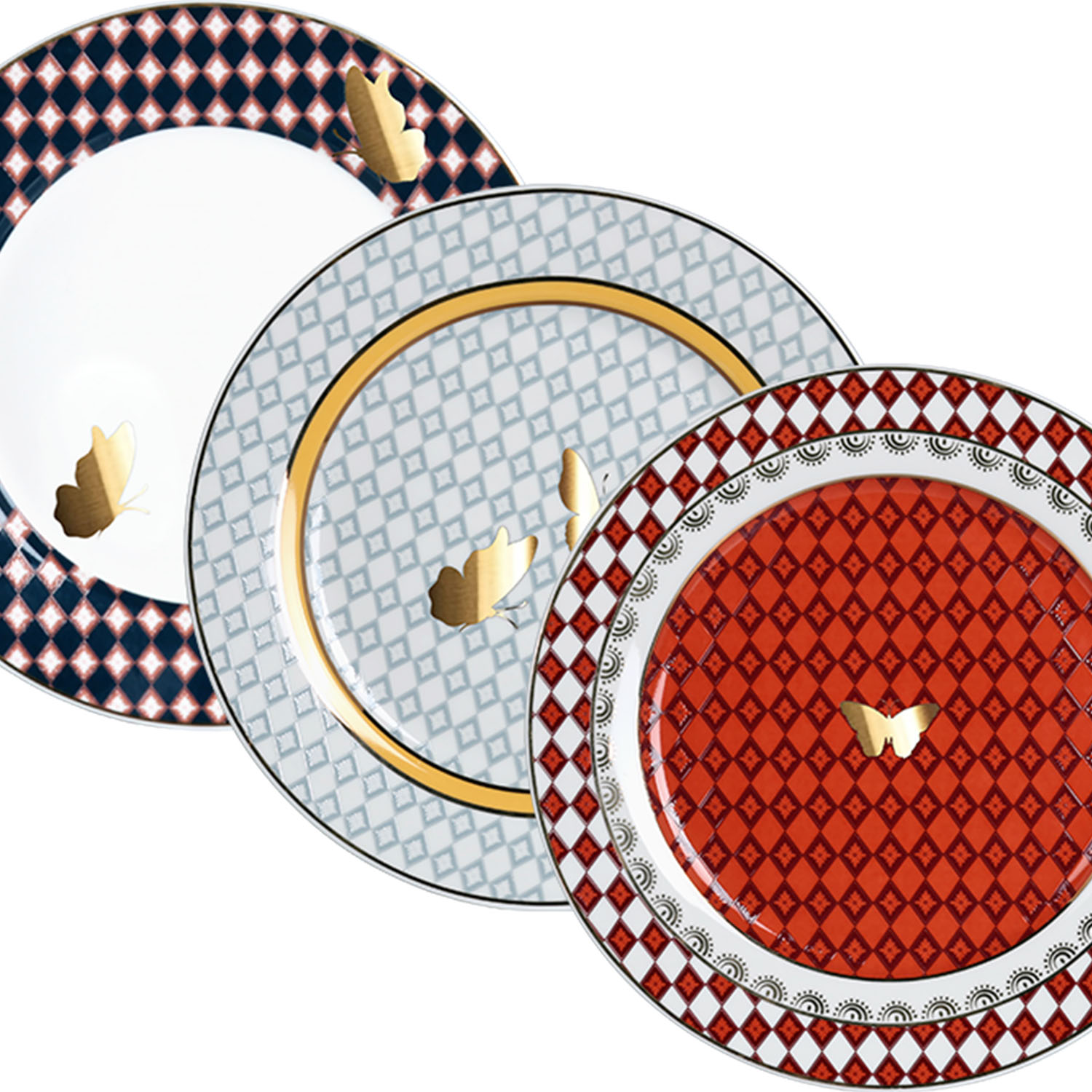 Tüm desenlerde ortak olarak zarif bir kelebek figürü yer almaktadır.