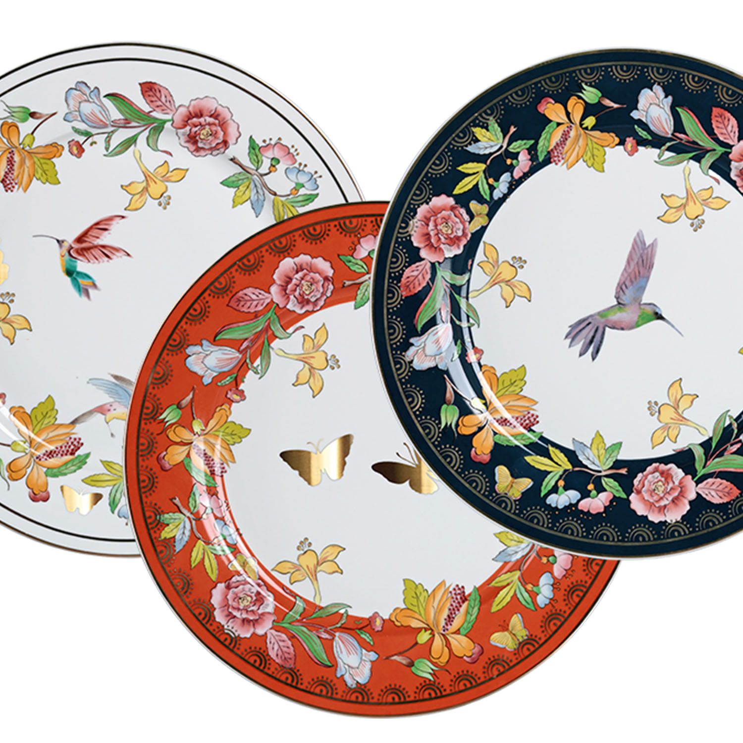 Tüm tabaklar zengin floral ve hayvan figürleriyle lüks bir görünüm sunar.