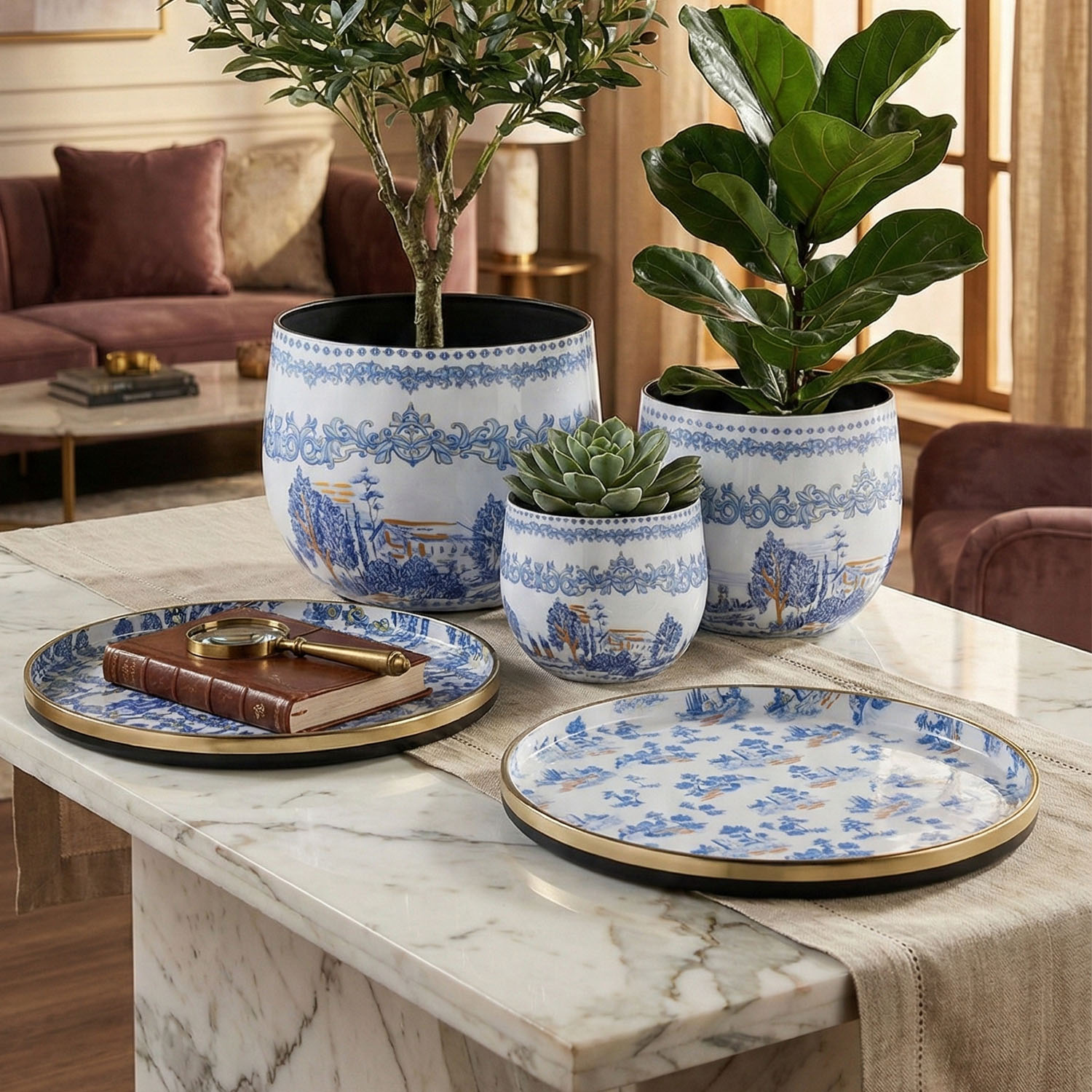 Florance Tepsi, 36 cm çapındaki yuvarlak formu ve narin mavi-beyaz çiçek desenleriyle sunumlarınıza klasik bir zarafet katıyor. Emaye kaplı metal malzemeden üretilmiş olması, tepsiyi hafif, dayanıklı ve göz alıcı parlaklıkta kılar. Altın rengi bordürü, tasarıma lüks bir çerçeve çizer.