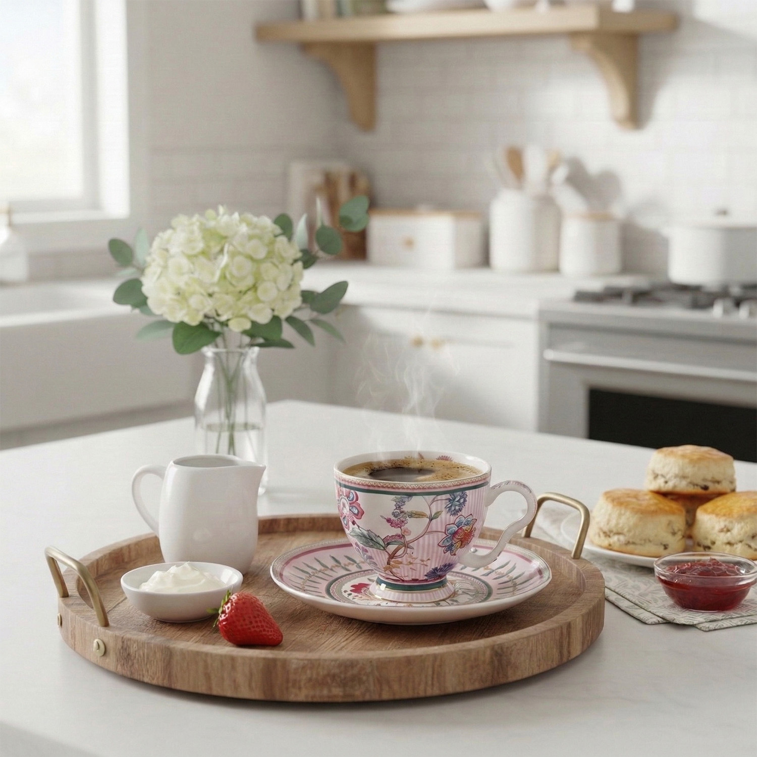 Estetik Tasarım: Pastel tonlardaki çiçek motifleri ve klasik formdaki ergonomik fincan kulpları ile hem modern hem de nostaljik sofralara kusursuz uyum sağlar.