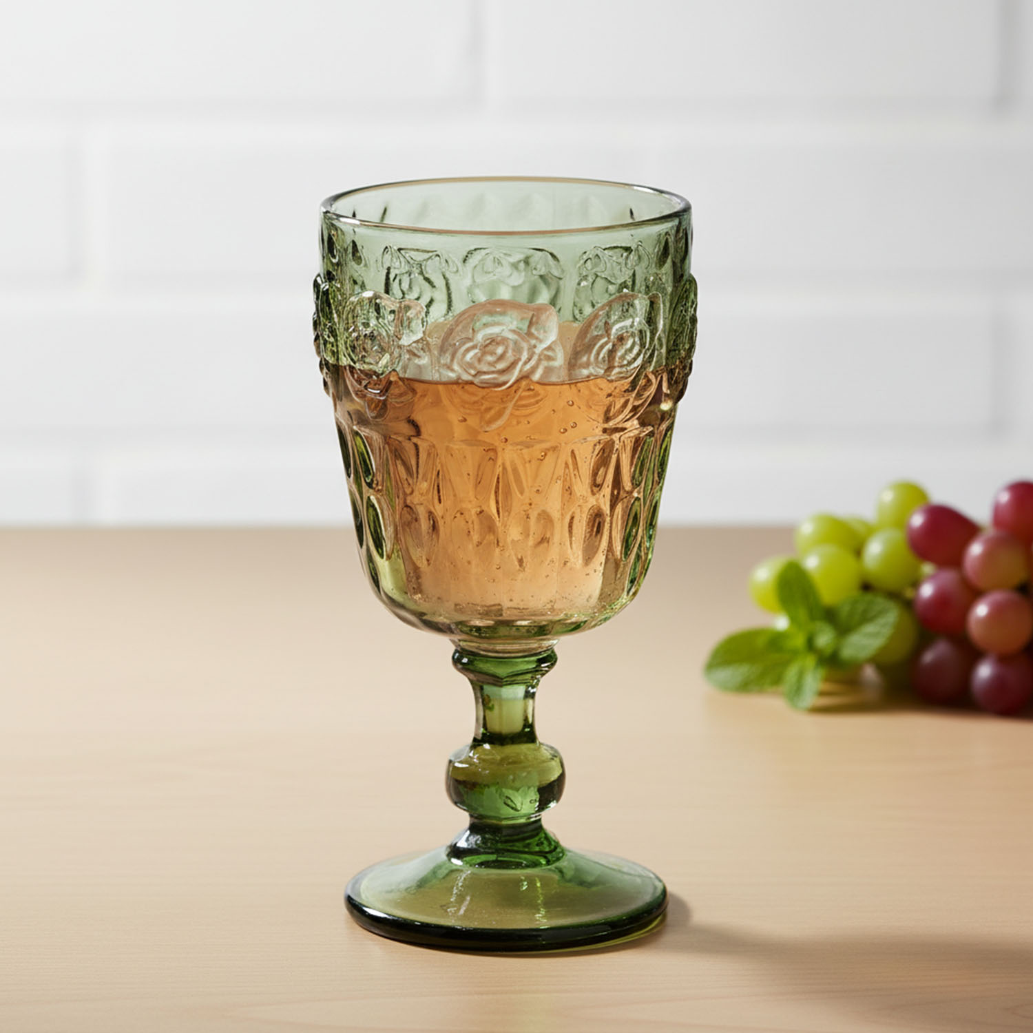 Kadehler, derin ve tazeleyici yeşil rengindedir. Kadeh kısmı kabartmalı ve dokulu bir yüzeye sahipken, ince ve zarif ayak detayı sunuma şıklık ve yükseklik katar.