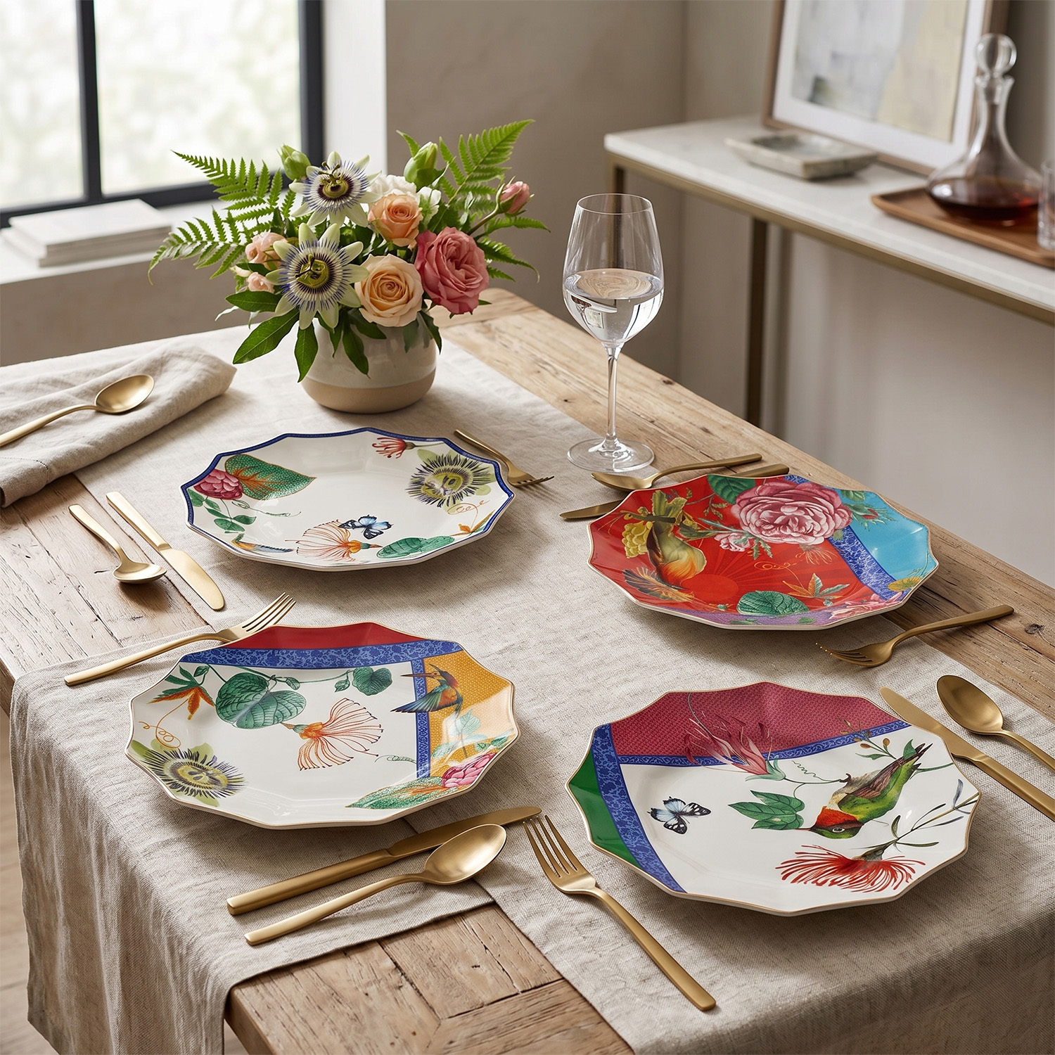 Sanatsal Mix & Match Konsepti: Her tabak; egzotik çiçekler, tropik kuşlar ve dinamik renk çerçeveleriyle birbirinden farklı illüstrasyonlara sahiptir. Bu özgün yaklaşım, sofranızda her misafire özel bir tasarım sunmanıza olanak tanır.