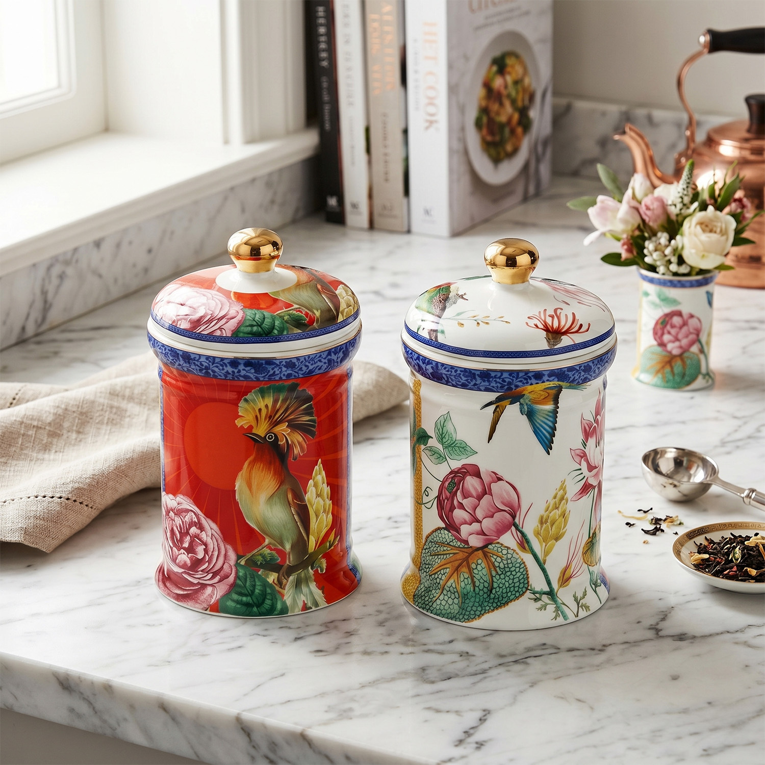 Tezgah üstü düzeninize egzotik bir zarafet katmaya ne dersiniz? Liorine serisinin imza desenlerini taşıyan bu 2'li kavanoz seti, Bone porselen kalitesi ve büyüleyici illüstrasyonlarıyla sadece bir saklama kabı değil, mutfağınızın en şık dekoratif parçası olacak.