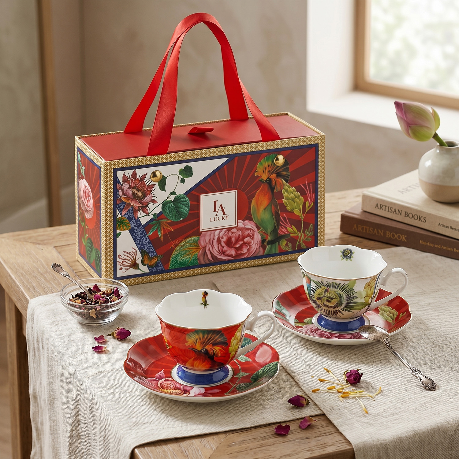 Günün en keyifli molasını, tropikal doğanın ve canlı renklerin buluştuğu sanatsal bir seremoniye dönüştürün! Liorine serisinin imzası olan egzotik kuş motiflerini ve zengin botanik desenlerini Bone porselenin pürüzsüz dokusuyla buluşturan bu 2'lü set, masanıza dinamik bir şıklık katar.
