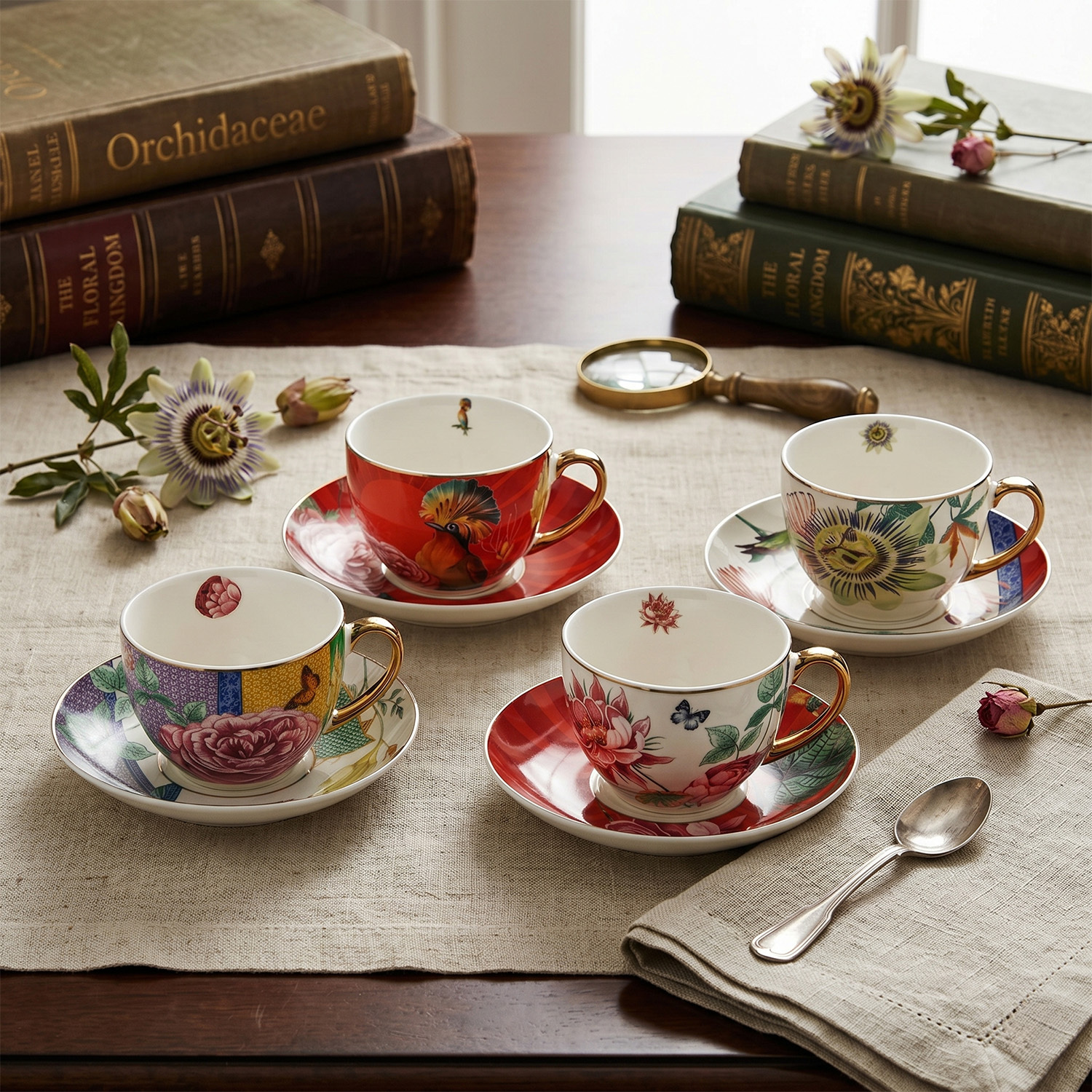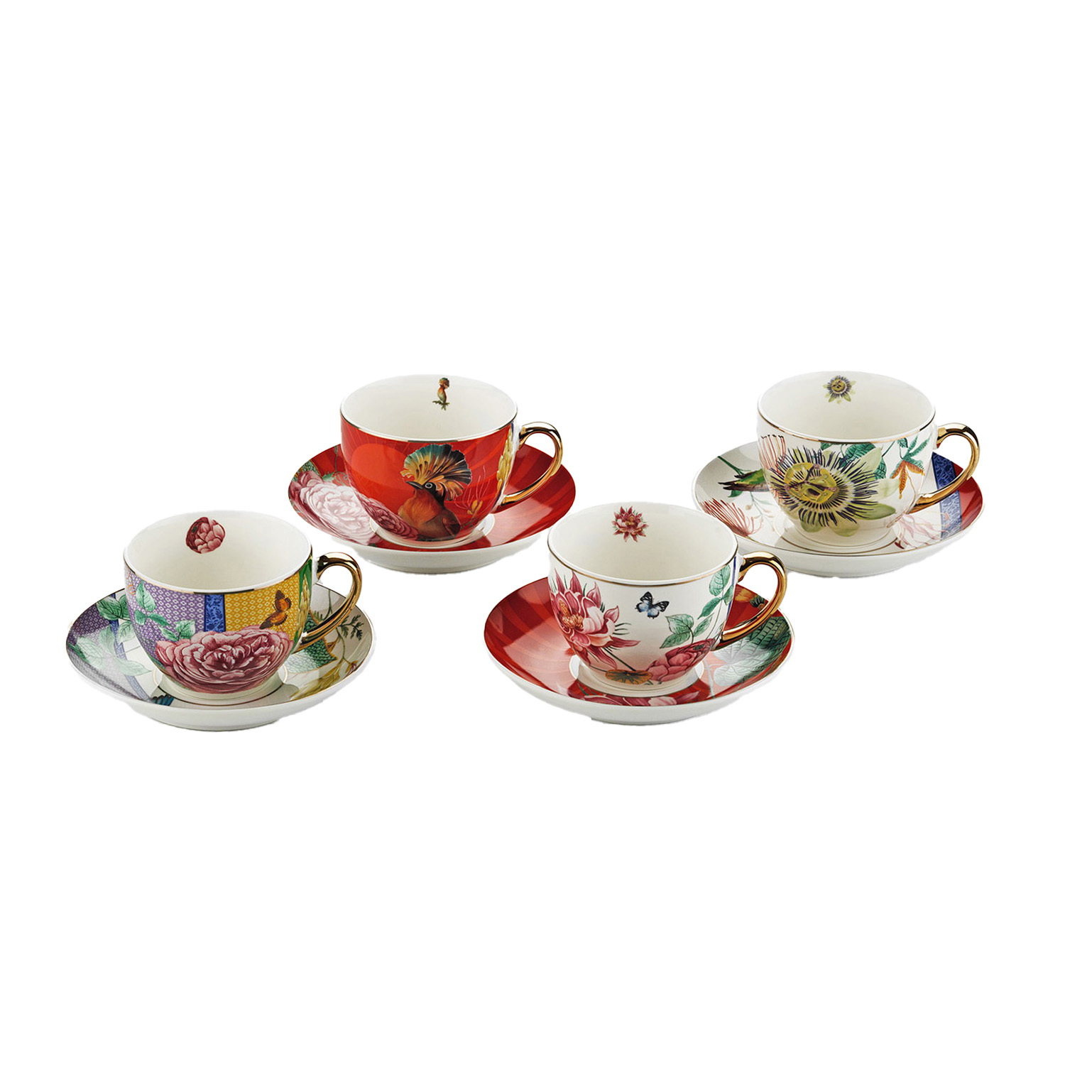 Egzotik Mix & Match Tasarımı: Her bir fincan ve tabak seti, serinin karakteristik tropik kuş, kelebek ve çiçek motifleriyle bezenmiş farklı bir desene sahiptir. Fincanların iç kısmındaki küçük desen detayları ve altın rengi zarif kulpları, tasarıma lüks bir derinlik katar.
