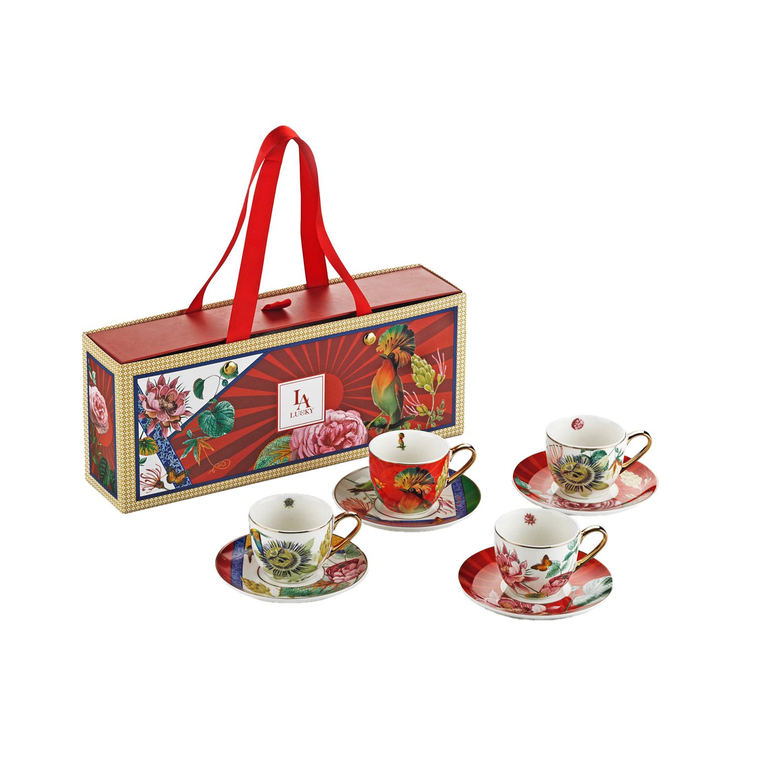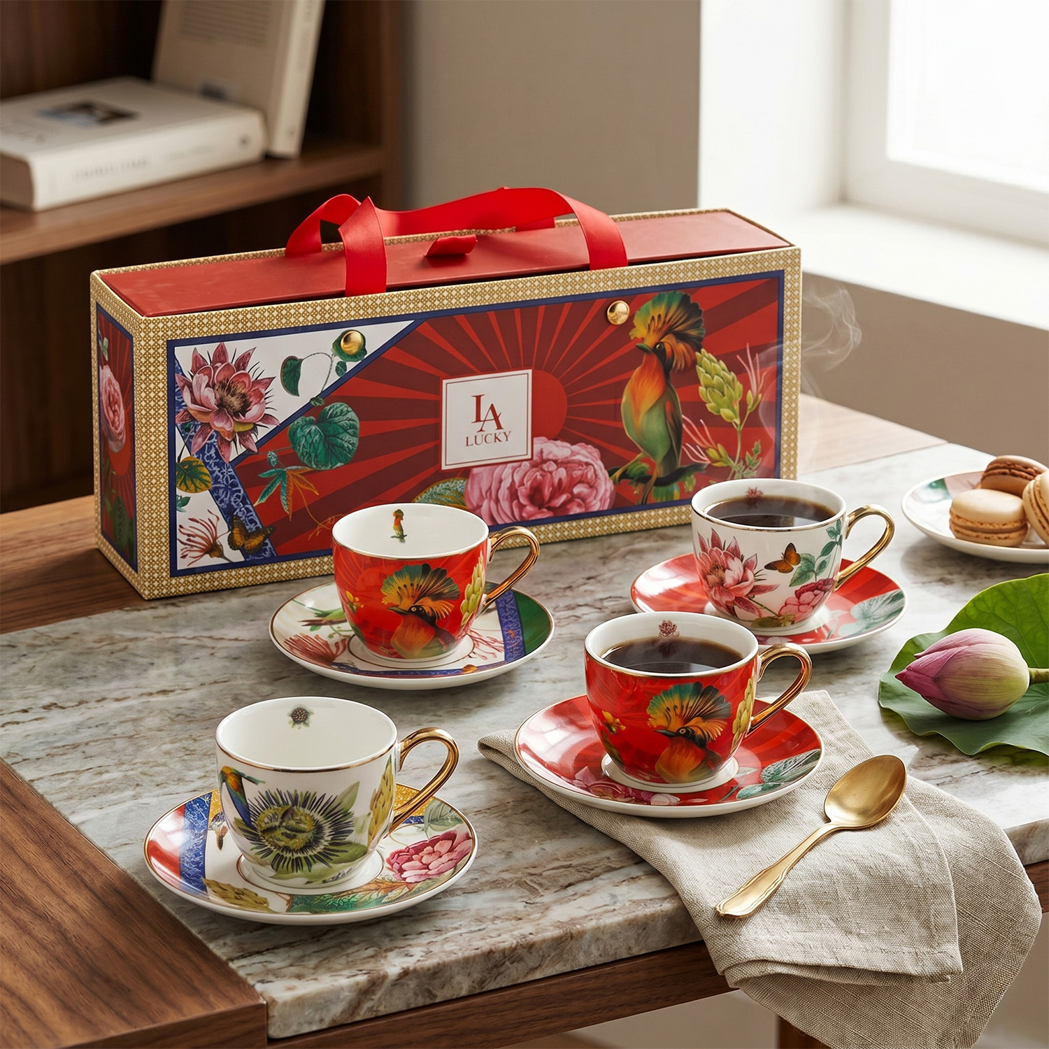 Günün en keyifli molasını, tropikal doğanın ve canlı renklerin buluştuğu sanatsal bir seremoniye dönüştürün! Liorine serisinin imzası olan egzotik kuş motiflerini ve zengin botanik desenlerini Bone porselenin pürüzsüz dokusuyla buluşturan bu 4'lü set, masanıza dinamik bir şıklık ve lüks bir dokunuş katar.