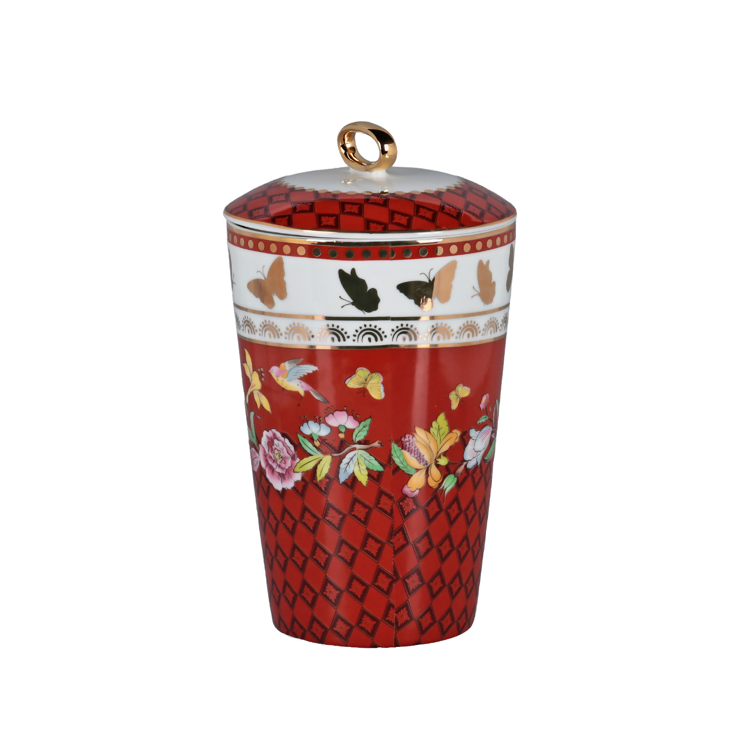 Kavanozun gövdesinde baskın olan parlak kırmızı zemin üzerinde, ortada geniş bir beyaz bant yer alır. Bu bant, narin çiçek ve kelebek motifleriyle süslenmiştir. Kapak ve gövdenin kenarlarında altın detaylı, kontrast oluşturan desenler bulunur.