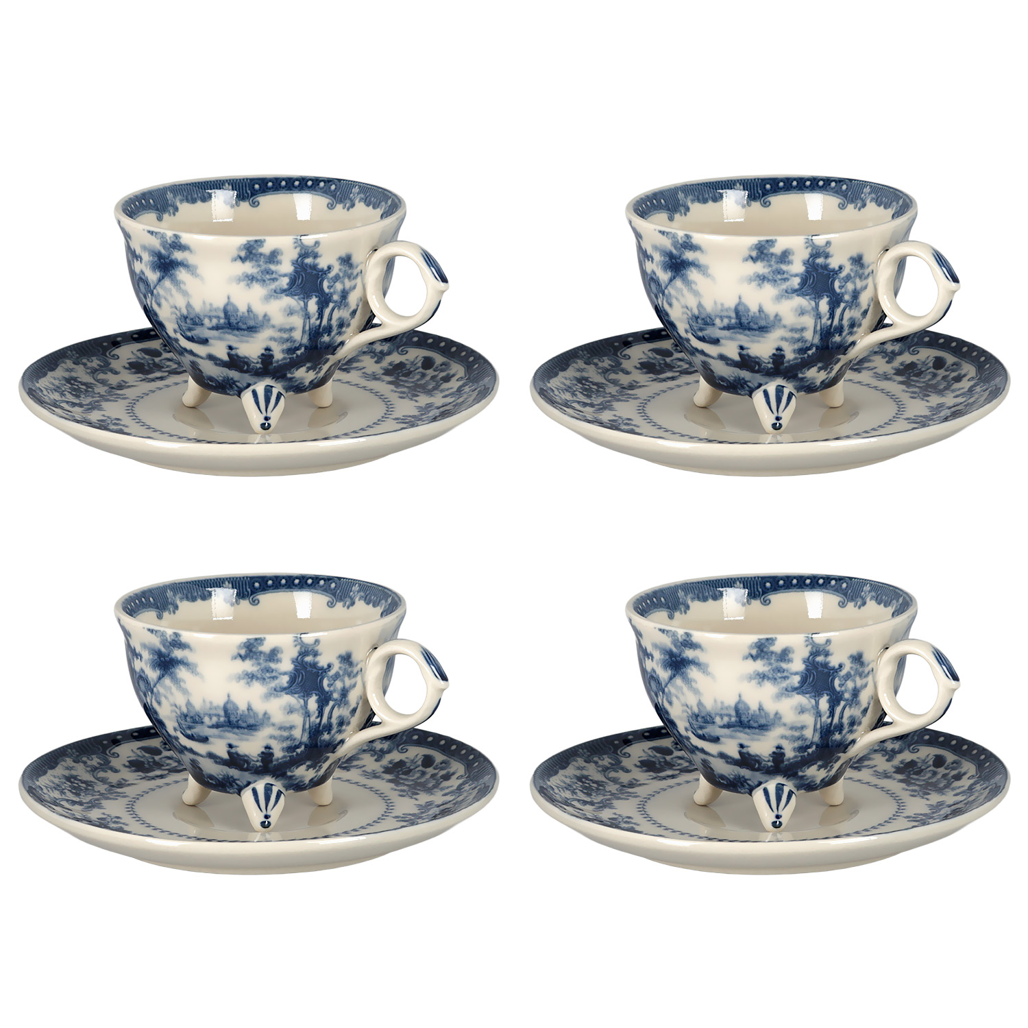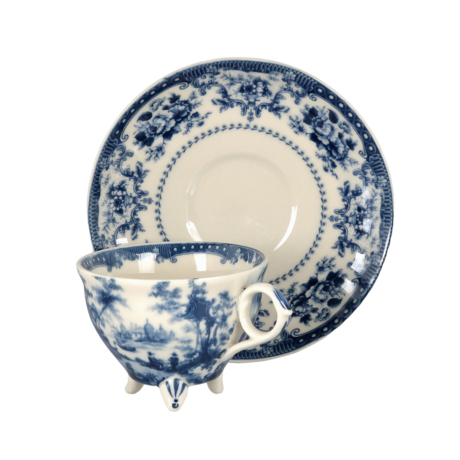 Fincanlar ve tabaklar, geleneksel porselen sanatını yansıtan, yoğun mavi renkte manzara veya pastoral motiflerle süslenmiştir. Beyaz zemin üzerinde yer alan bu desenler, fincan ağzında ve kulplarda bulunan mavi bordürlerle tamamlanmıştır.