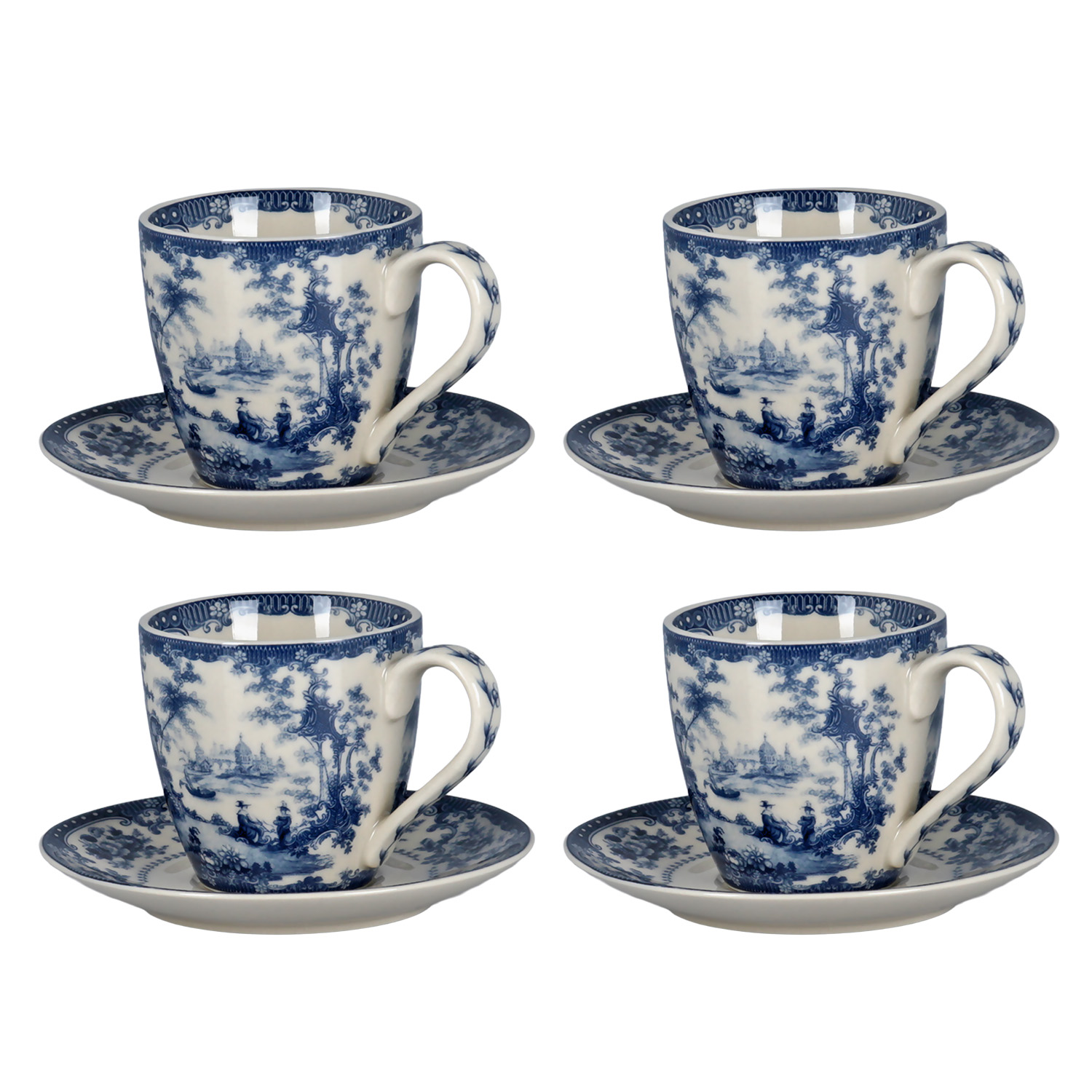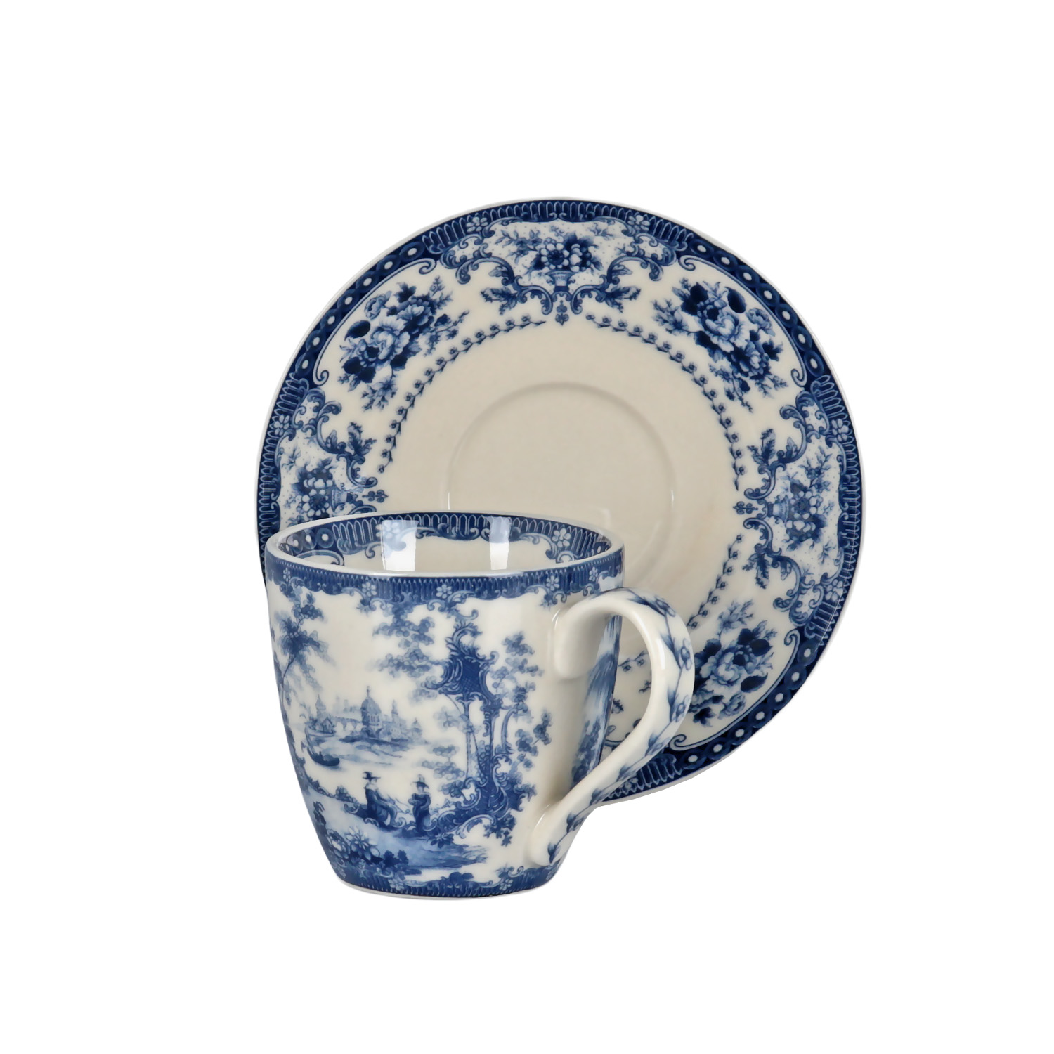 Fincanlar ve tabaklar, geleneksel porselen sanatını yansıtan, yoğun mavi renkte manzara veya pastoral motiflerle süslenmiştir. Beyaz zemin üzerindeki bu monokrom desenler, fincan ağzındaki ve kulplardaki mavi bordürlerle tamamlanmıştır.