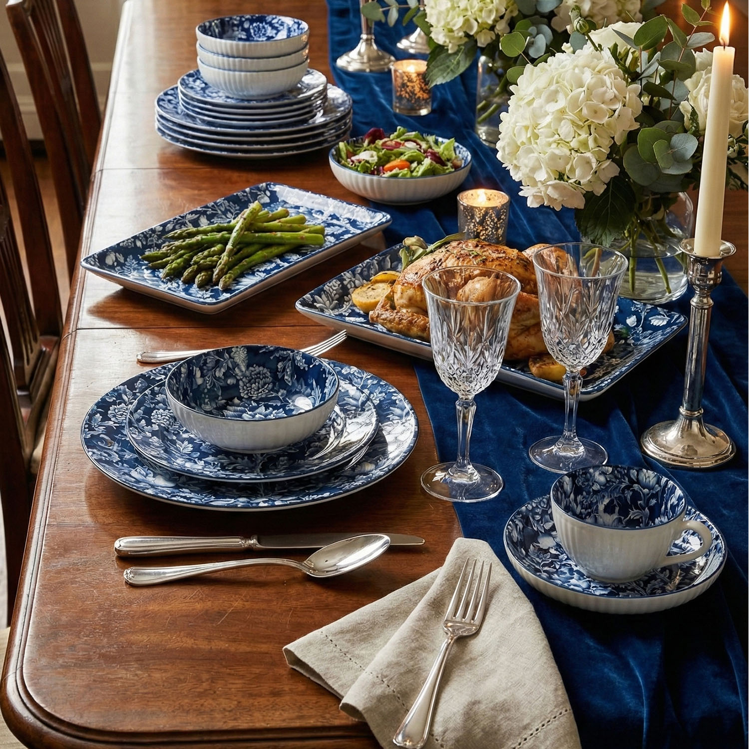 Kaselerin iç yüzeyi, geleneksel sanatı yansıtan, yoğun mavi-beyaz tonlarda manzara veya floral motiflerle süslenmiştir. Dış yüzey ise desenin zarafetini dengeleyen, beyaz renkte ve dikey fitilli bir dokuya sahiptir.
