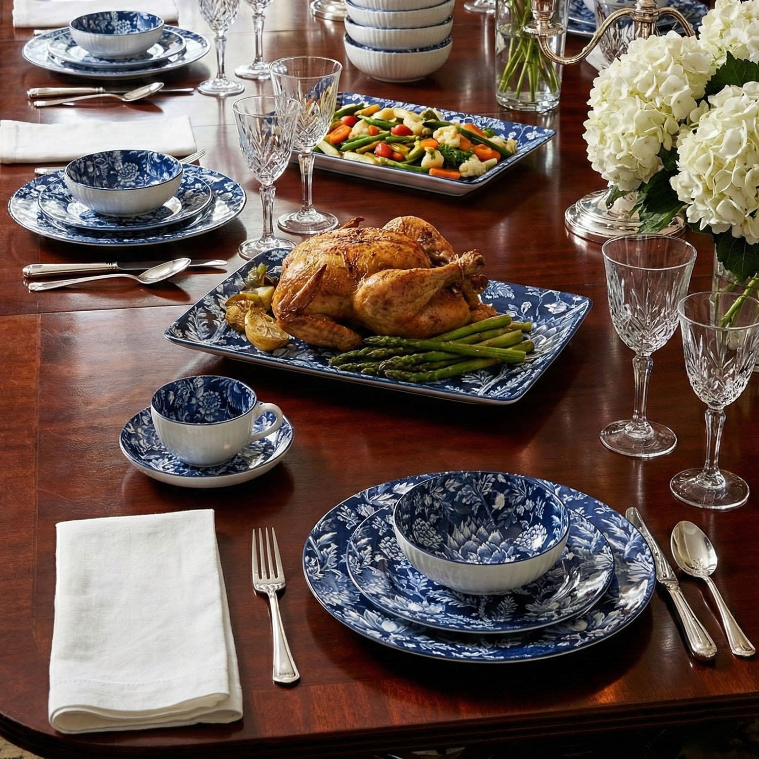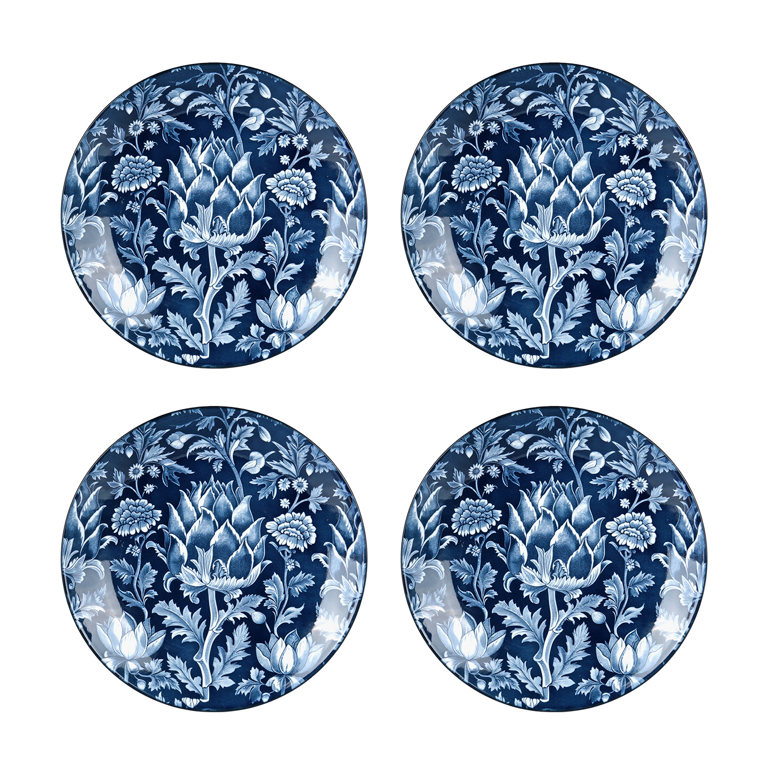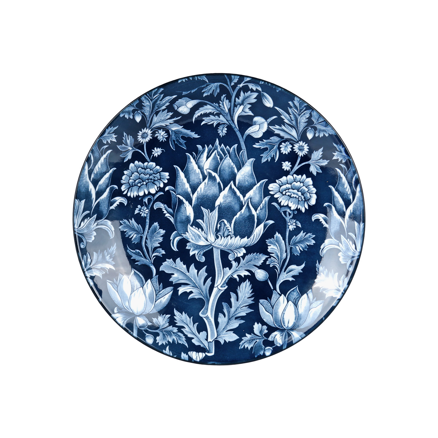 Tabaklar, yoğun lacivert/mavi ve beyaz tonlarında, yaprak ve floral motiflerin yer aldığı, klasik porselen sanatını anımsatan bir desenle tamamen kaplanmıştır. Desenin zenginliği, ürüne derinlikli ve sanatsal bir görünüm verir.