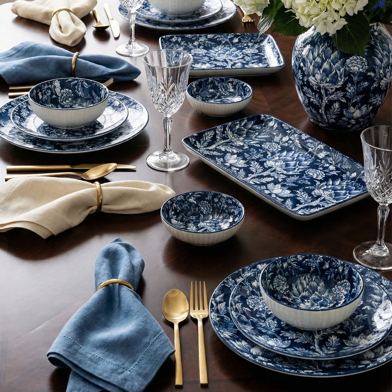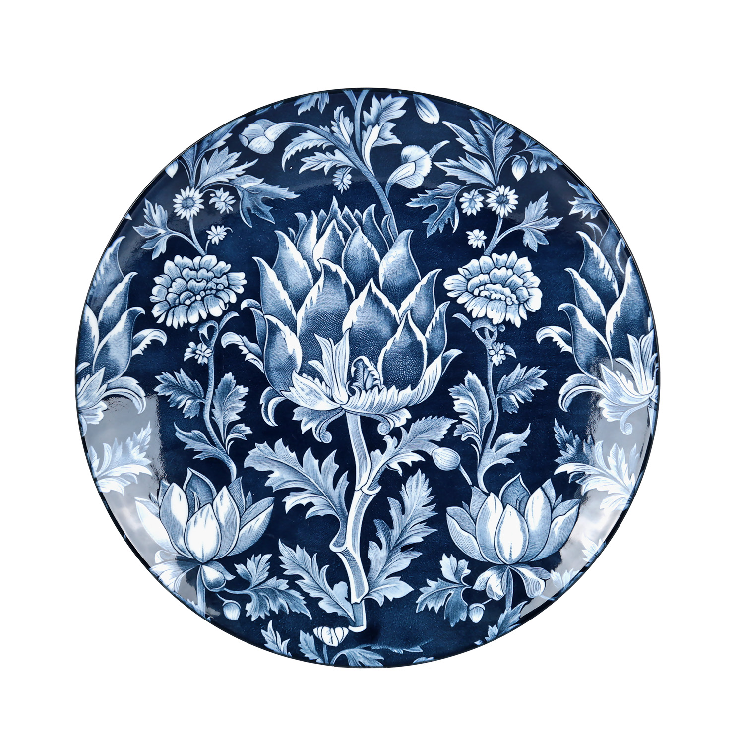 Tabaklar, yoğun lacivert/mavi ve beyaz tonlarında, detaylı ve merkezi bir floral/bitkisel motifin yer aldığı, klasik porselen sanatını anımsatan bir desenle tamamen kaplanmıştır. Desenin zenginliği, ürüne derinlikli ve sanatsal bir görünüm verir.