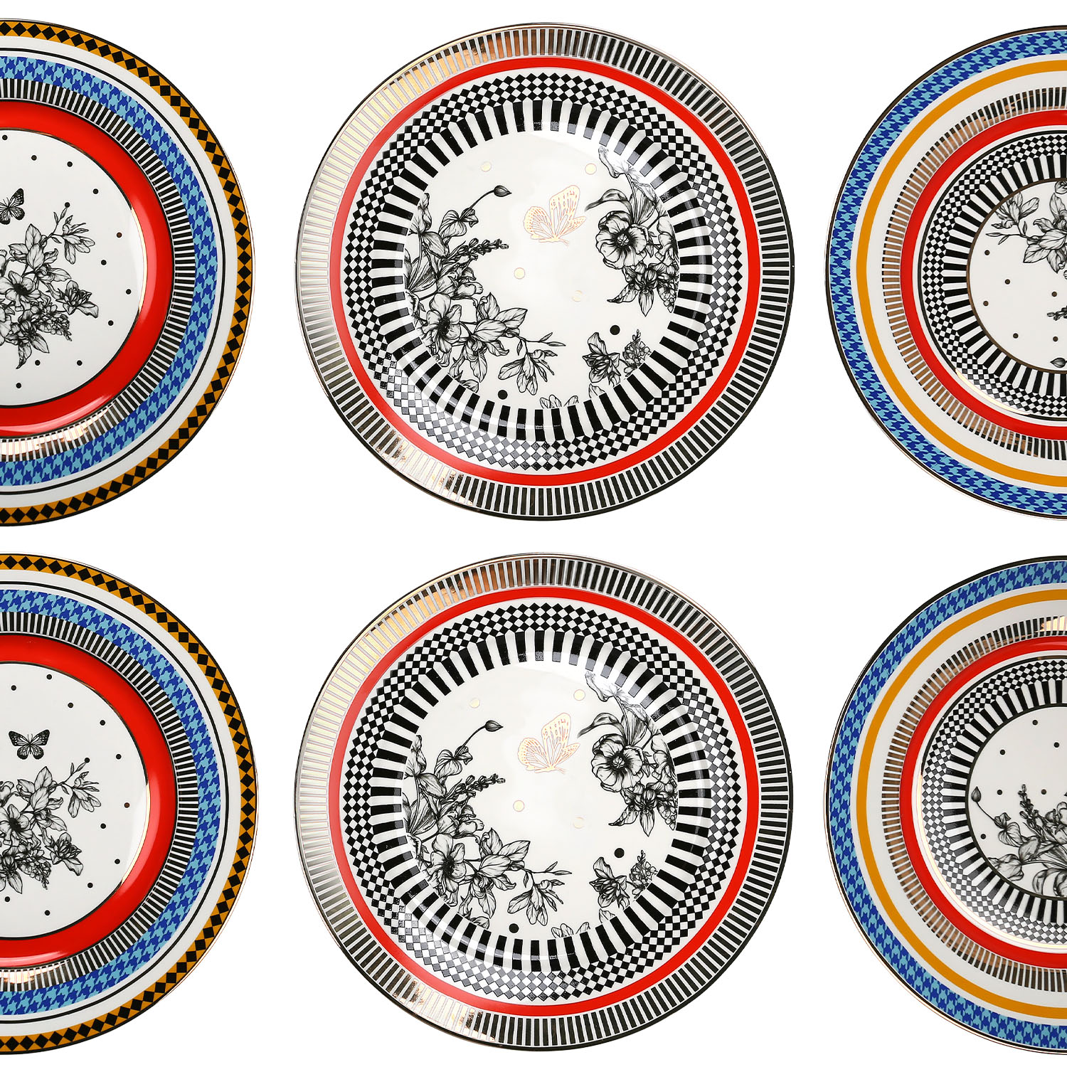 Lucky Art Maggey New Bone China Porselen 27cm 6lı Servis Tabağı el çizimi çiçekler ve zarif kelebek motifleriyle hayat buluyor. Siyah-beyaz detayların enerjik renklerle birleştiği bu koleksiyon, sofistike ve zamansız bir şıklık sunuyor. Sanatsal dokunuşlarıyla her öğünü özel bir deneyime dönüştürüyor. 27 cm çapındaki her bir tabağın ideal boyut hem ana yemeklerinizi hem de tatlı, kek veya atıştırmalıklarınızı şık bir şekilde sunmanızı sağlar.