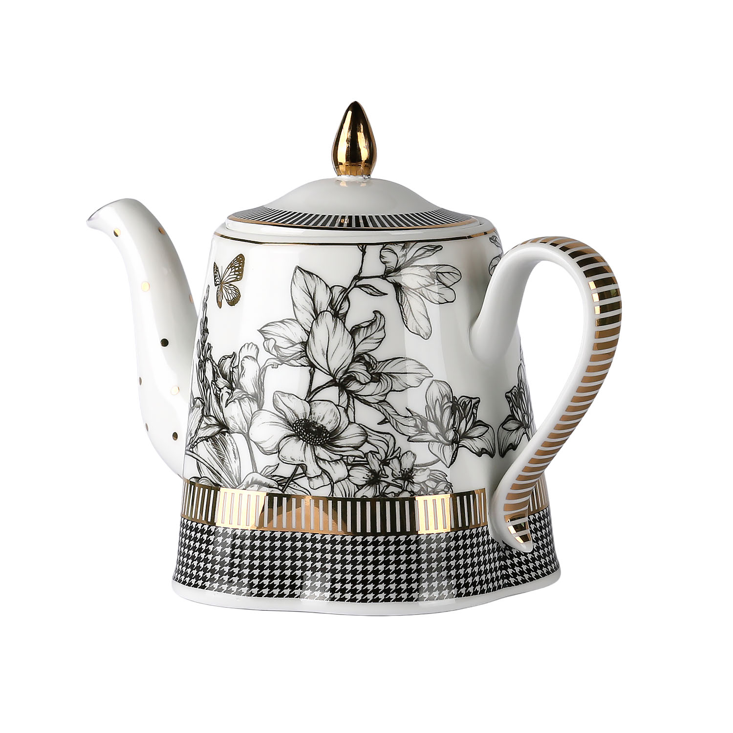 Lucky Art Maggey New Bone China Porselen Çaydanlık el çizimi çiçekler ve zarif kelebek motifleriyle hayat buluyor. Siyah-beyaz detayların enerjik renklerle birleştiği bu koleksiyon, sofistike ve zamansız bir şıklık sunuyor. Sanatsal dokunuşlarıyla her öğünü özel bir deneyime dönüştürüyor. Yüksek kaliteli bone china porselenden üretilmiş bu zarif çaydanlık, özenle seçilmiş desenlerle bezenmiş olup çay saatlerinize zarif bir dokunuş ekler.