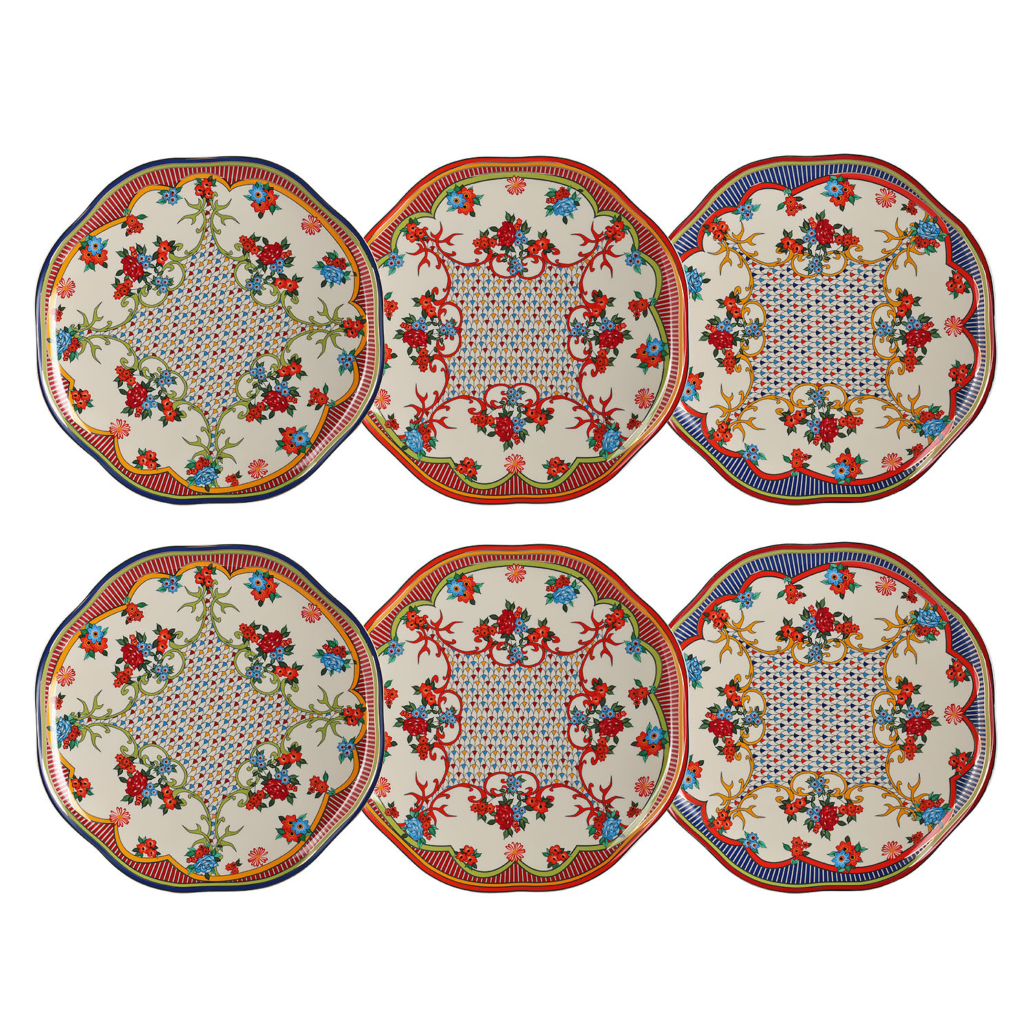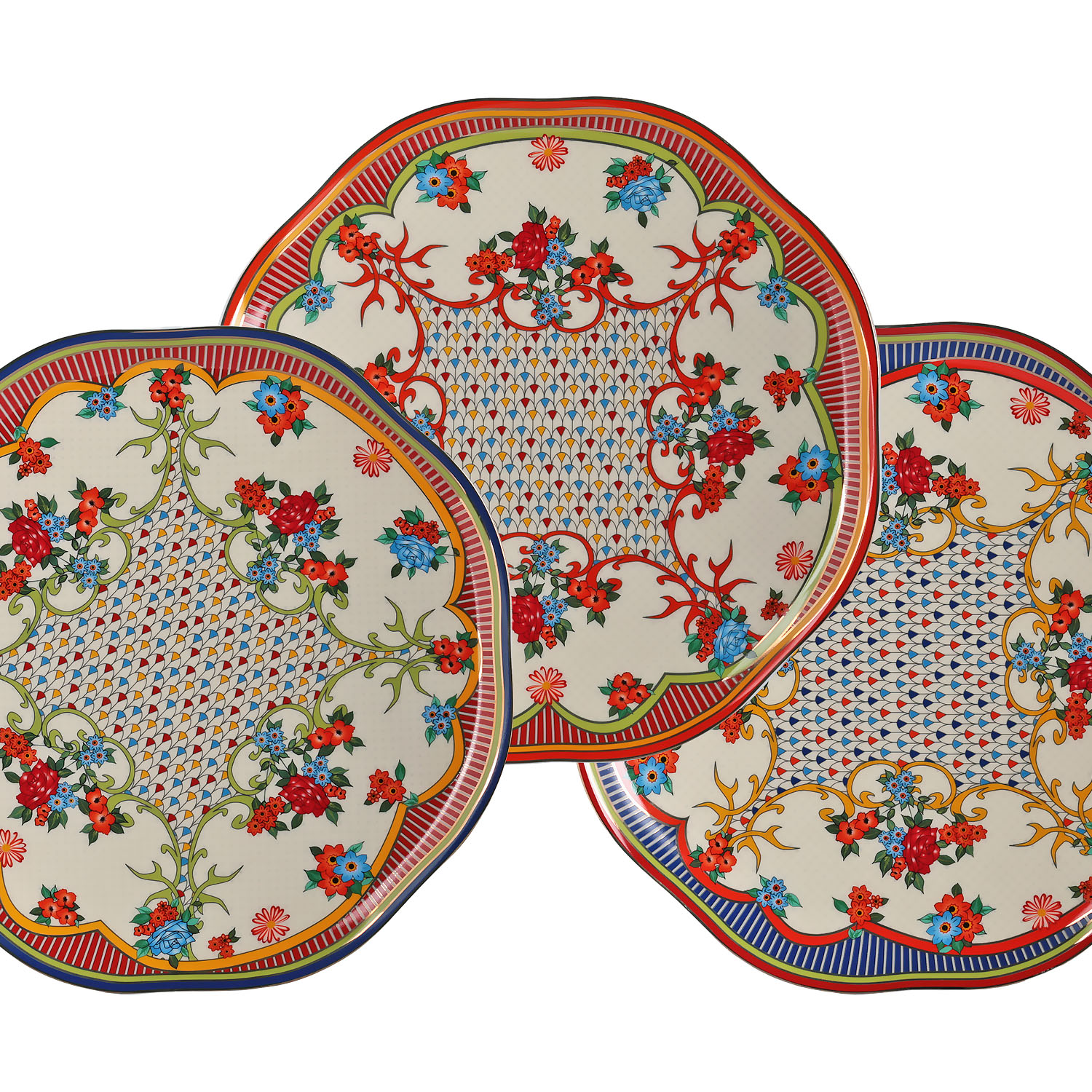 Fiora Serisi, çiçek bahçelerinin coşkusunu, Akdeniz’in sıcak renklerini ve geleneksel desenlerin zarafetini bir araya getiriyor. Her bir parça, el işçiliğini andıran ince detaylarla bezenmiş; kırmızı güller, mavi çiçekler ve altın kıvrımlar, sofranıza adeta bir sanat eseri gibi yerleşiyor.