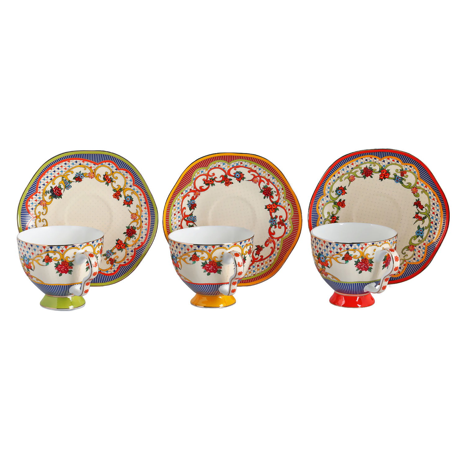 Canlı renklerin enerjisi, altın detayların zarafetiyle dengelenirken, farklı desenlerin uyumlu birleşimi sofranıza hem oyunbaz hem de sofistike bir hava katıyor. Günlük yemeklerde pozitif bir enerji, özel davetlerde ise hayranlık uyandıran bir şıklık sunuyor.