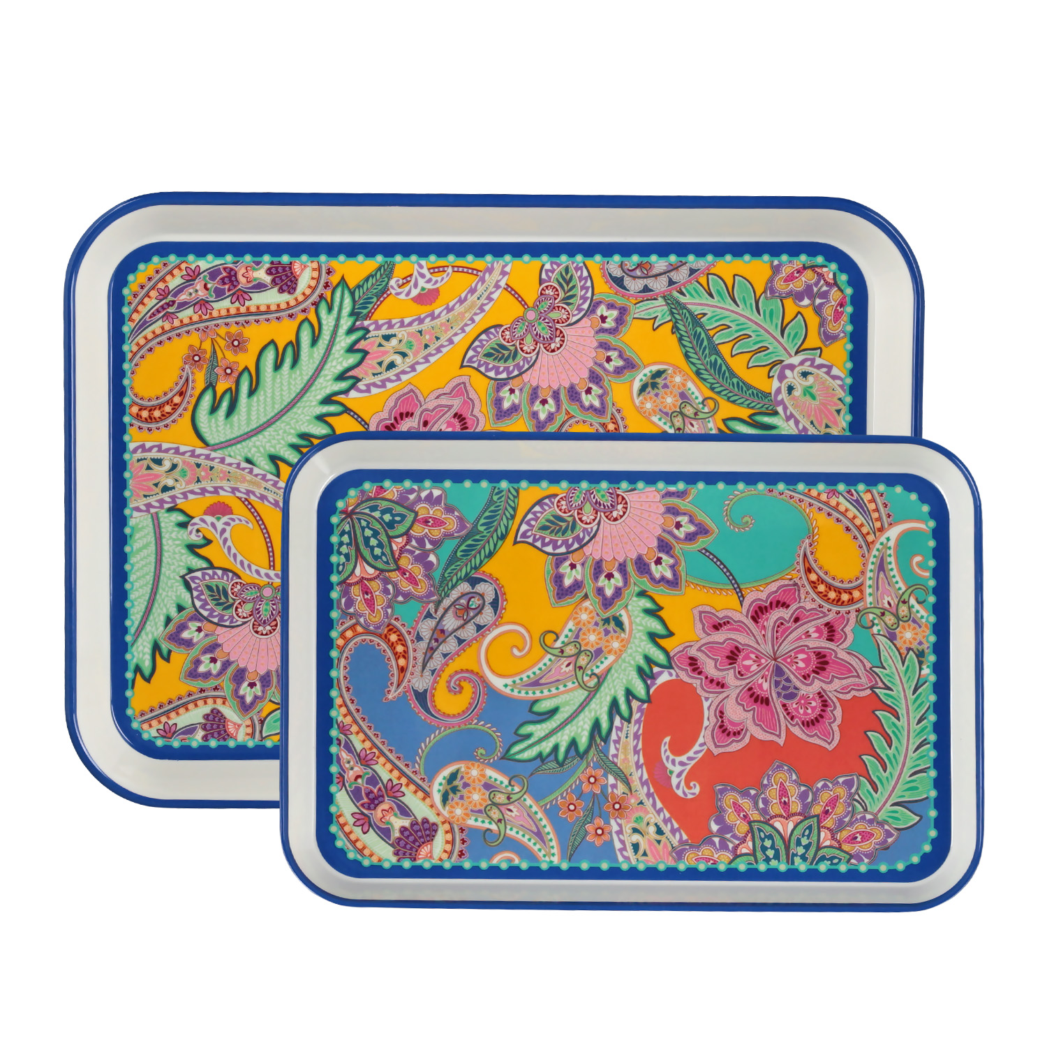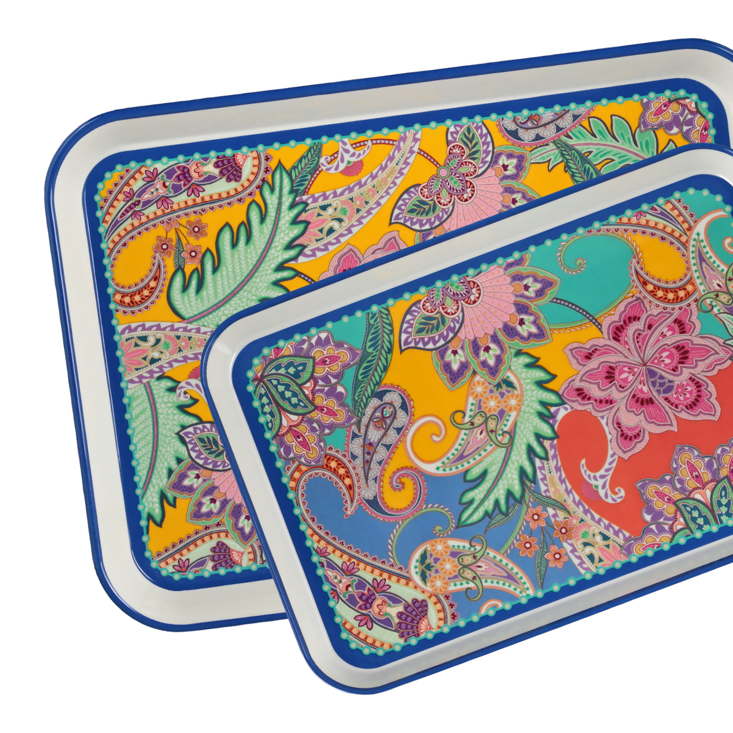 PAISELLE 2'li Tepsi Seti, farklı boyutlardaki iki dikdörtgen tepsisiyle servislerinizi kolaylaştırmak ve sofranıza egzotik bir canlılık katmak üzere tasarlanmıştır. Set, canlı paisley desenine sahiptir ve parlak, sıcak renk kombinasyonlarıyla servislerinize neşeli bir hava katar. Her iki tepsinin de kenar bordürü belirgin mavi renktedir.