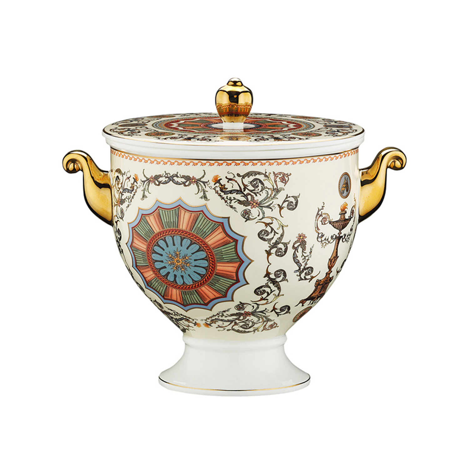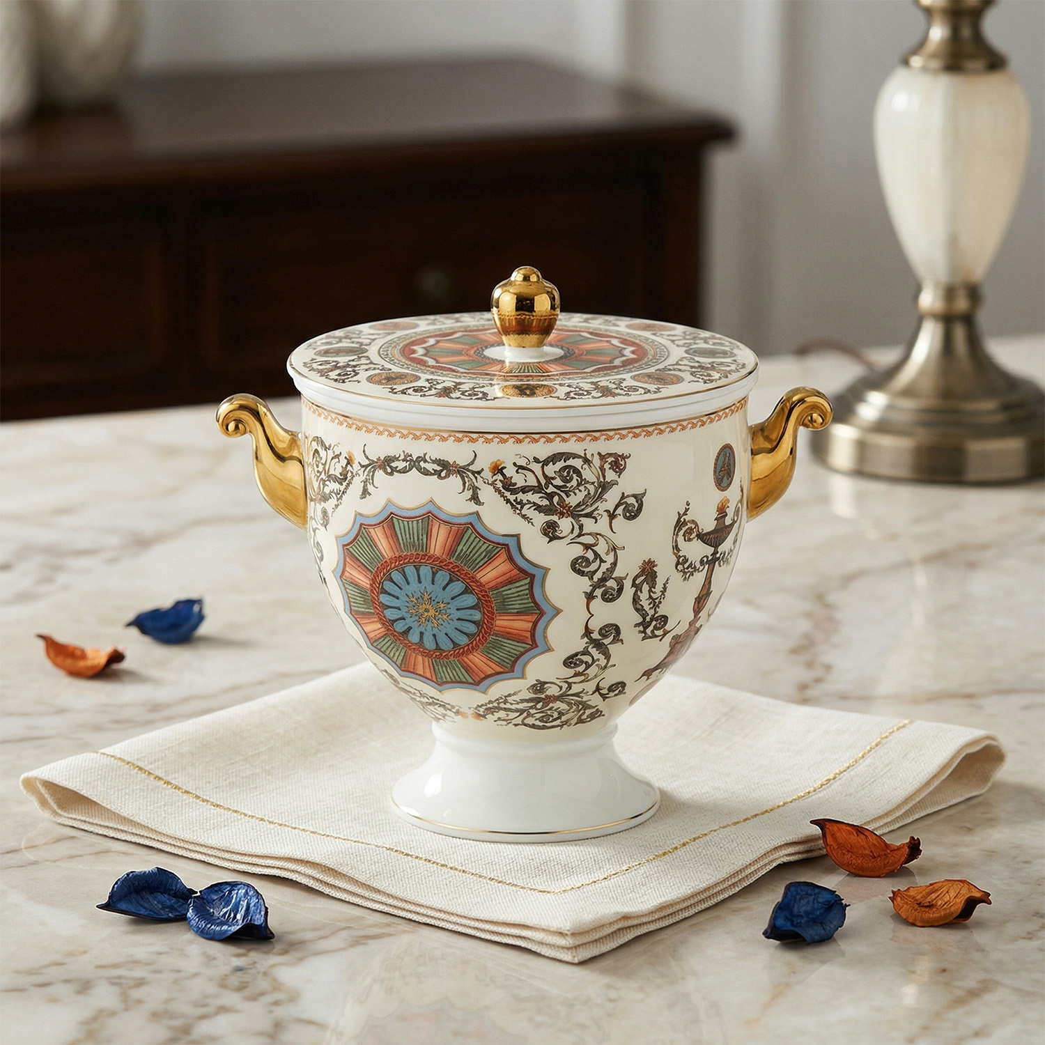 Bone Porselen ve Altın İhtişamı: Bone porselen materyalden üretilmiştir. Kavanozun yan kısımlarında yer alan karakteristik kavisli kulplar ve kapak üzerindeki küre kulp, parlak altın rengiyle tasarlanarak tasarıma lüks bir bitiş kazandırır.