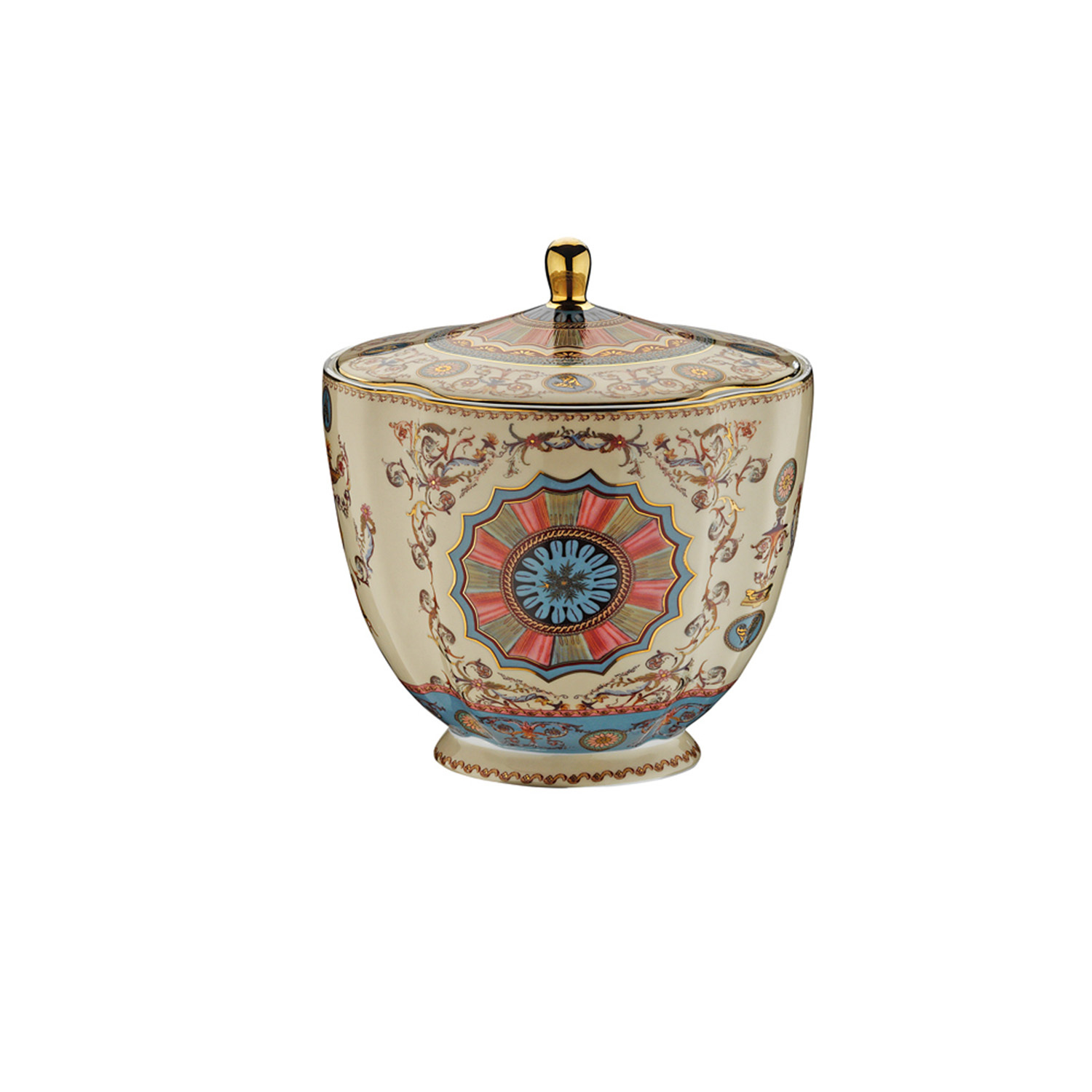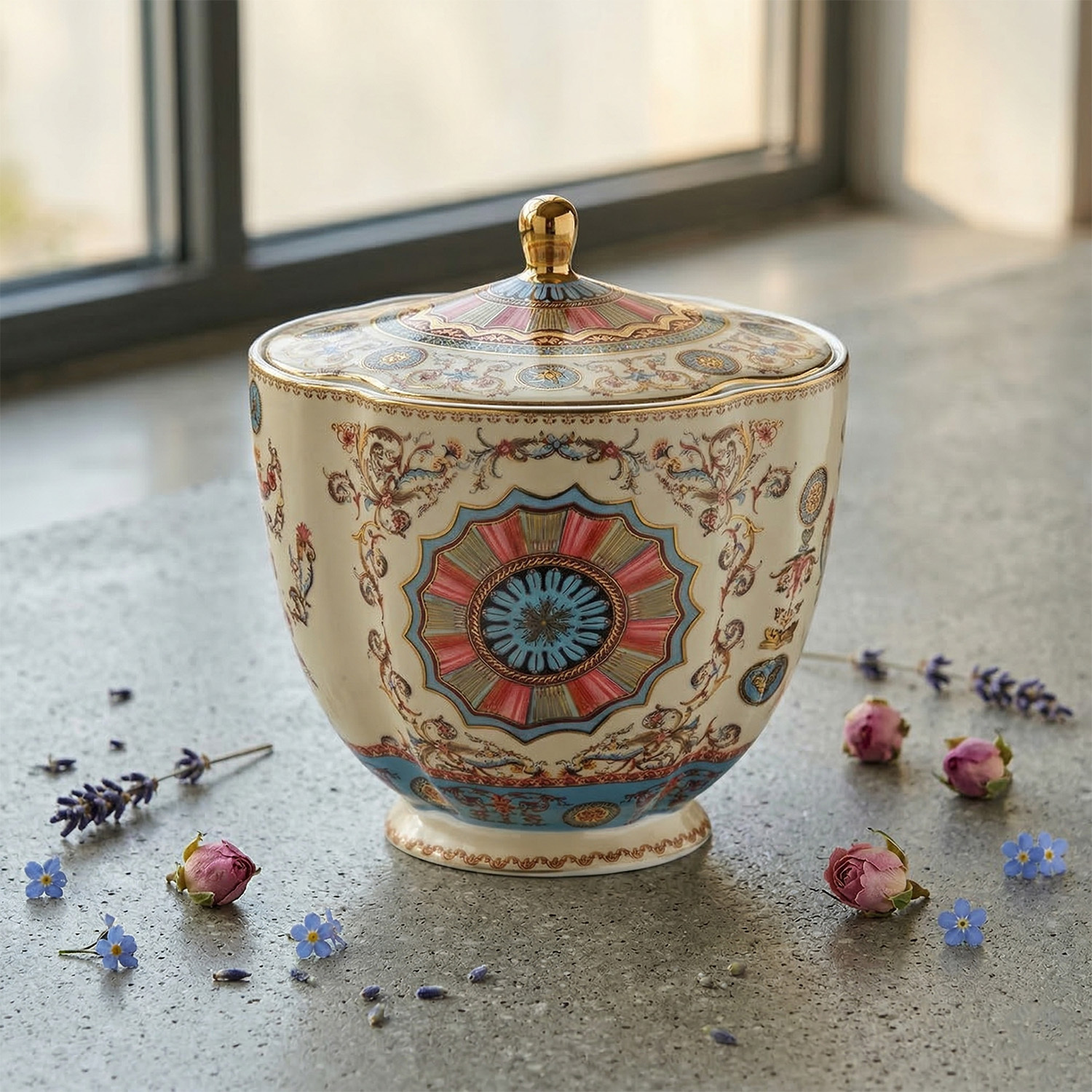 Altın Detaylı Şık Tasarım: Kapak üzerindeki gold (altın rengi) kulp ve kenar yaldızları, karakteristik desenlerle birleşerek mutfağınıza saray şıklığı getirir.