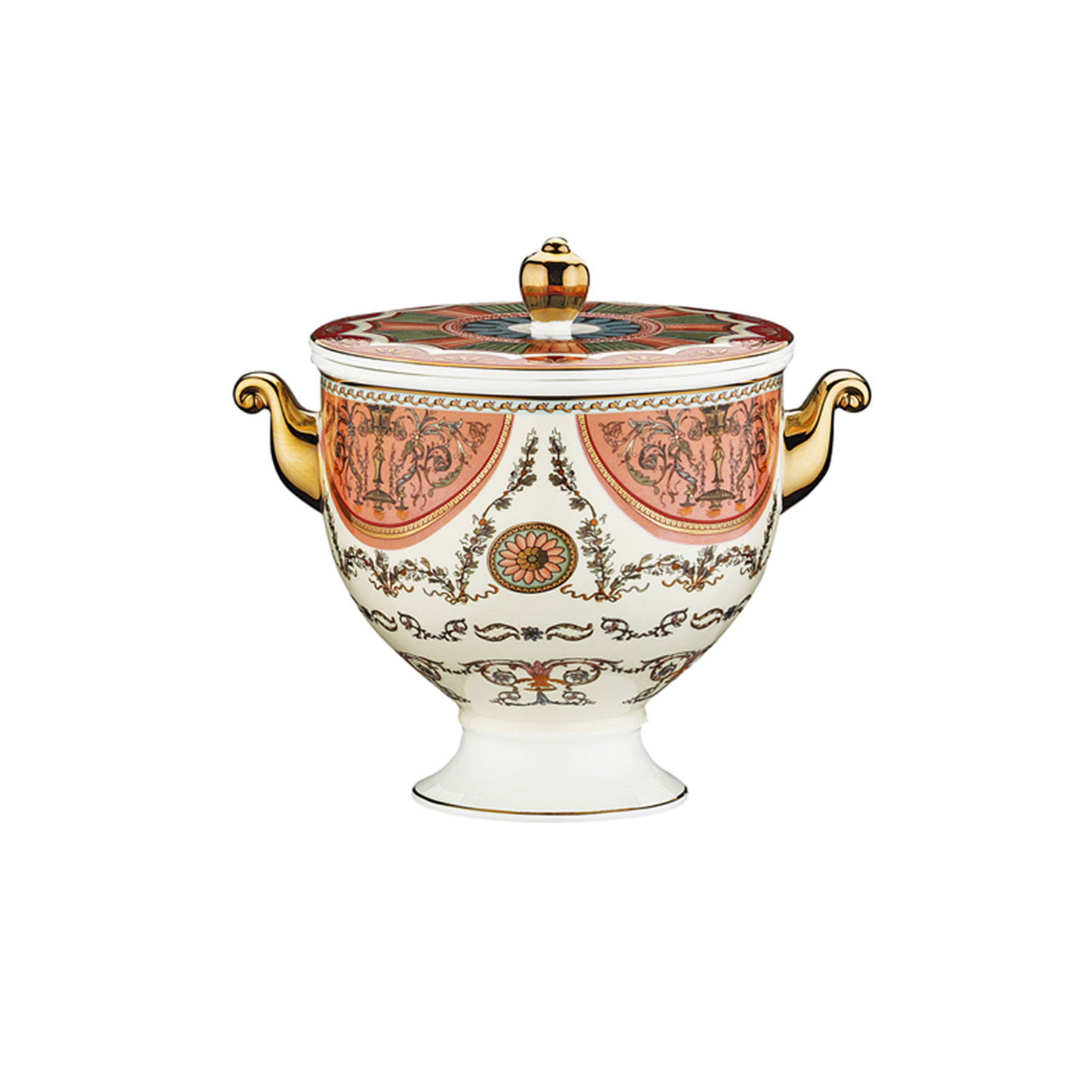 Bone Porselen ve Altın İhtişamı: Bone porselen materyalden üretilmiştir. Kavanozun yan kısımlarında yer alan karakteristik kavisli kulplar ve kapak üzerindeki küre kulp, parlak altın rengiyle tasarlanarak tasarıma lüks bir bitiş kazandırır.