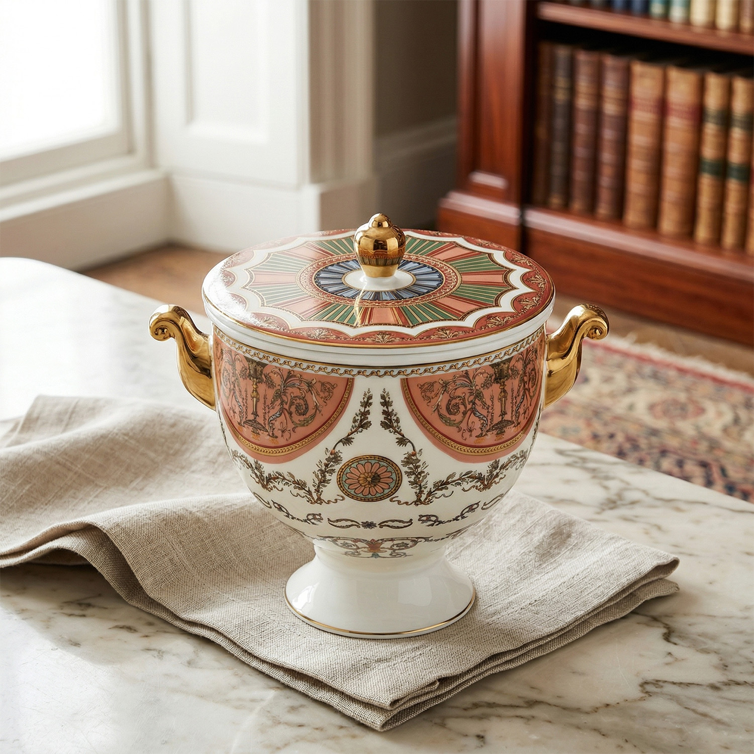 Mistik Rosea Desenleri: Gövdedeki krem zemin üzerine işlenen kiremit ve antrasit tonlarındaki geleneksel motifler, antik bir derinlik sunar. Kapağın merkezindeki dairesel desenler, gövde ile kusursuz bir görsel ritim yakalar. Beyaz porselen ayaklı kaide yapısı, tasarımı asil bir şekilde dengeler.