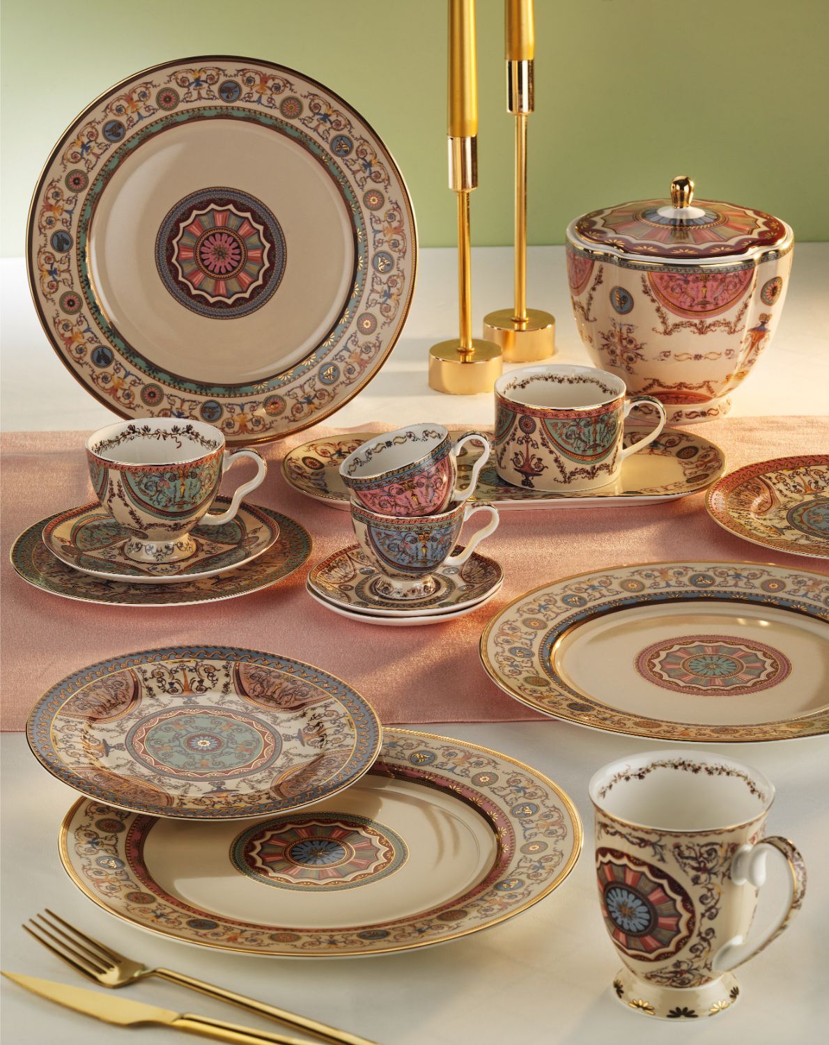 Şık ve Otantik Tasarım: Rosea serisinin derin renk tonları ve altın yaldızlı detayları, masanızda tek kişilik ama ihtişamlı bir saray şıklığı yaratır.