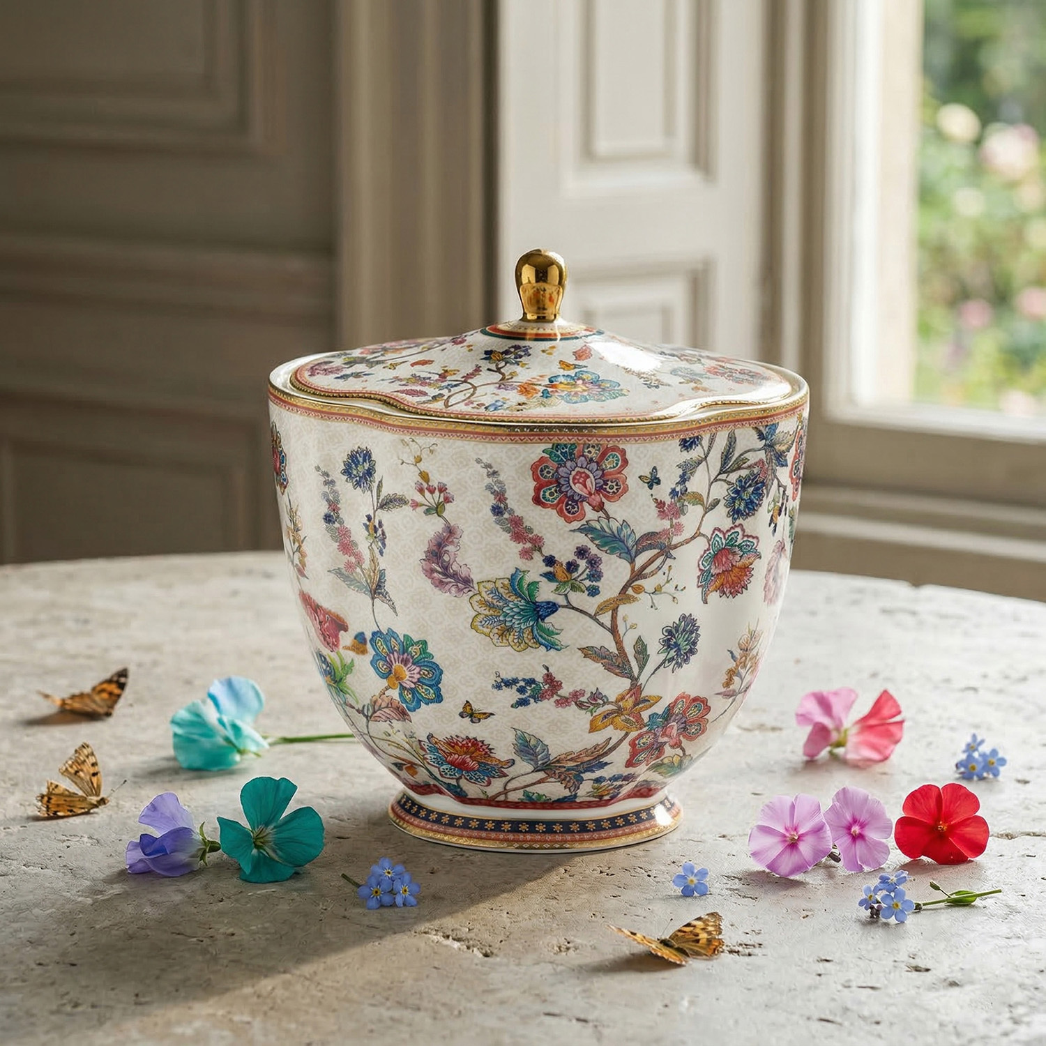 Altın Detaylı Şık Tasarım: Kapak üzerindeki gold (altın rengi) kulp ve kenar yaldızları, zarif çiçek motifleriyle birleşerek masanıza saray şıklığı getirir.