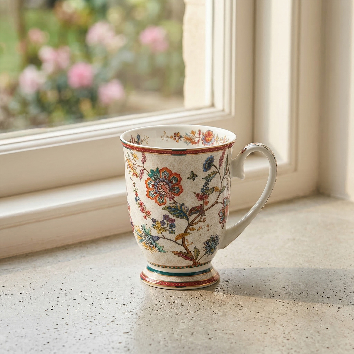 Modern ve Şık Konsept: Serenity serisinin zarif çiçek desenleri ve altın yaldızlı kenar detayları, kupanın estetik kavisli formuyla birleşerek masanızda modern bir sanat şıklığı yaratır.