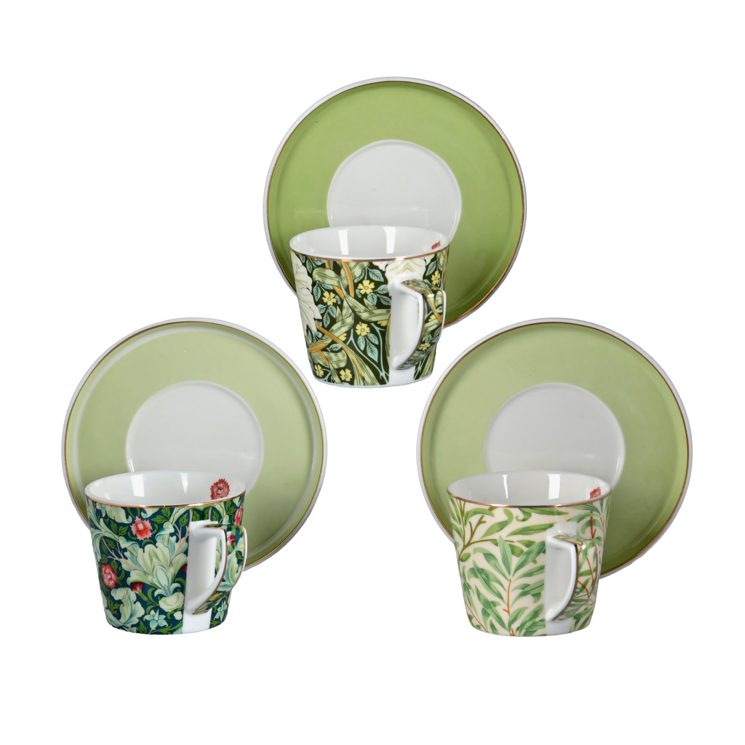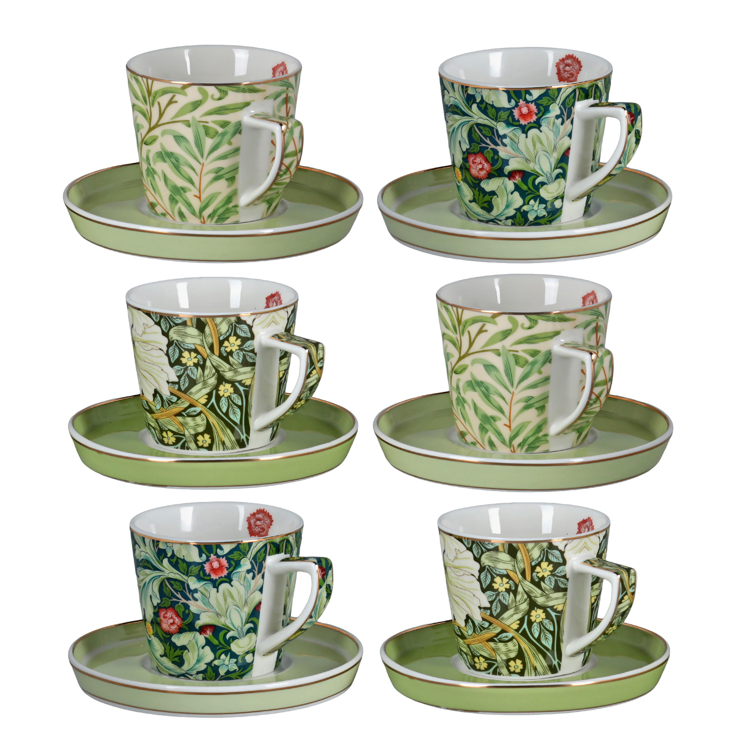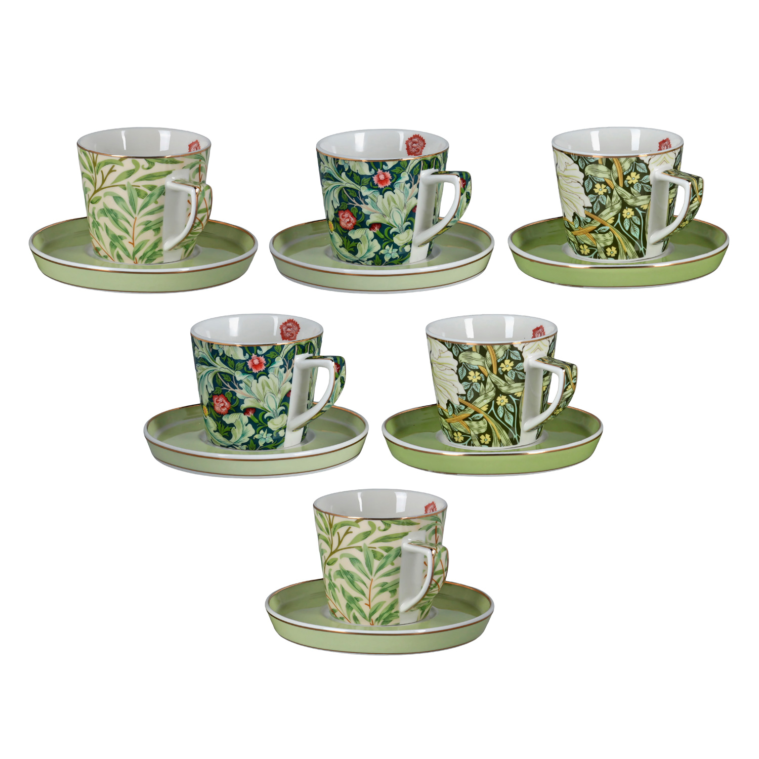 Fincanlar, beyaz zemin üzerinde canlı yeşil yapraklar ve kırmızı meyvelerden oluşan, bahar temalı motiflerle bezenmiştir. Tabaklar, desenli fincanları dengeleyen, sade ve açık yeşil renktedir. Fincanlardaki desenlerin küçük farklılıkları sete doğal bir çeşitlilik katar.