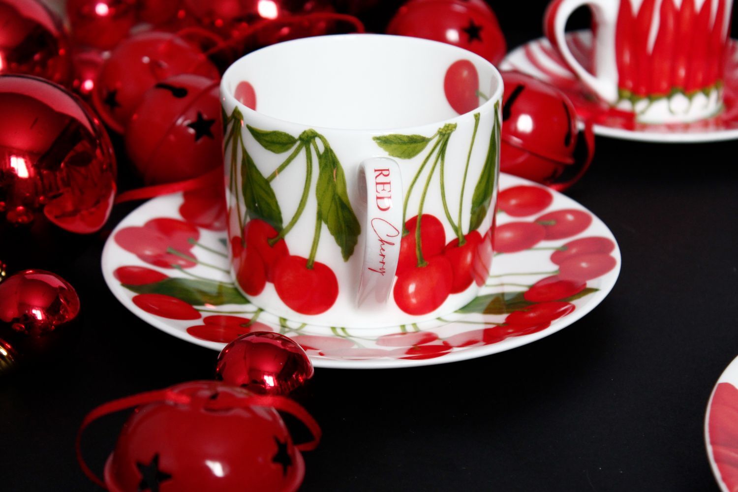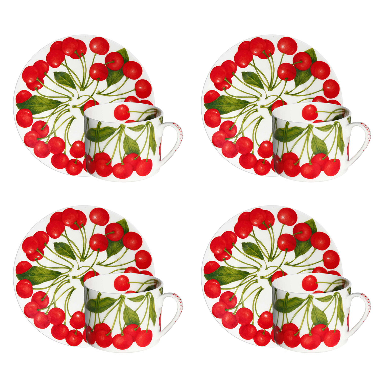 Sanatsal Temalar: Fincan ve tabak yüzeyini radyal bir formda saran iştah açıcı kiraz desenleri, sunumlarınıza organik bir canlılık ve modern bir estetik katar.