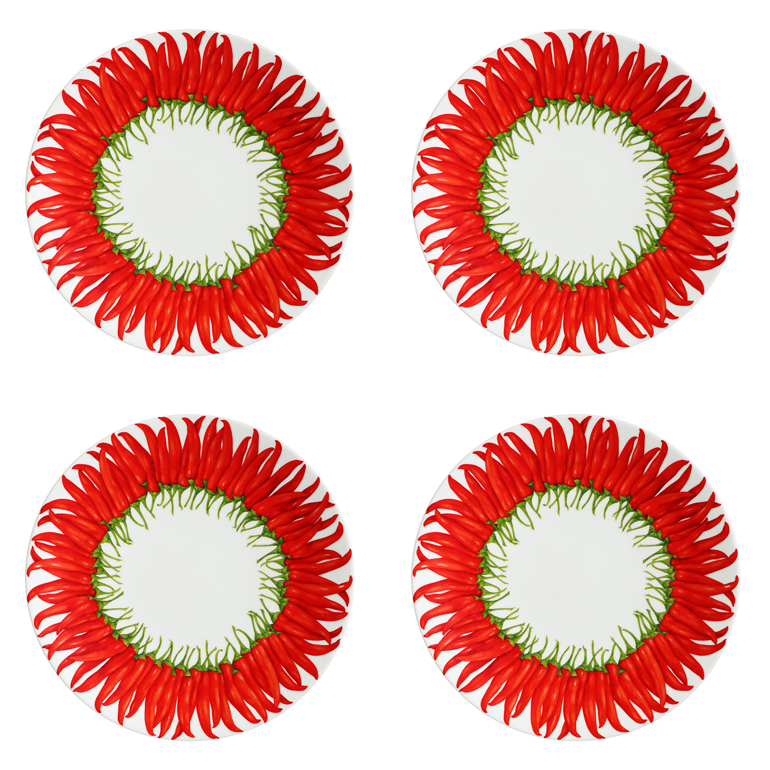 TAITU koleksiyonunun bu çarpıcı parçası, sofralarınıza doğanın en dinamik renklerini ve enerjisini katmak için tasarlandı. Tabağın kenarlarını bir taç gibi saran canlı kırmızı acı biber motifleri, porselenin saf beyazlığıyla mükemmel bir kontrast oluşturarak sunumlarınızı bir sanat eserine dönüştürür.
