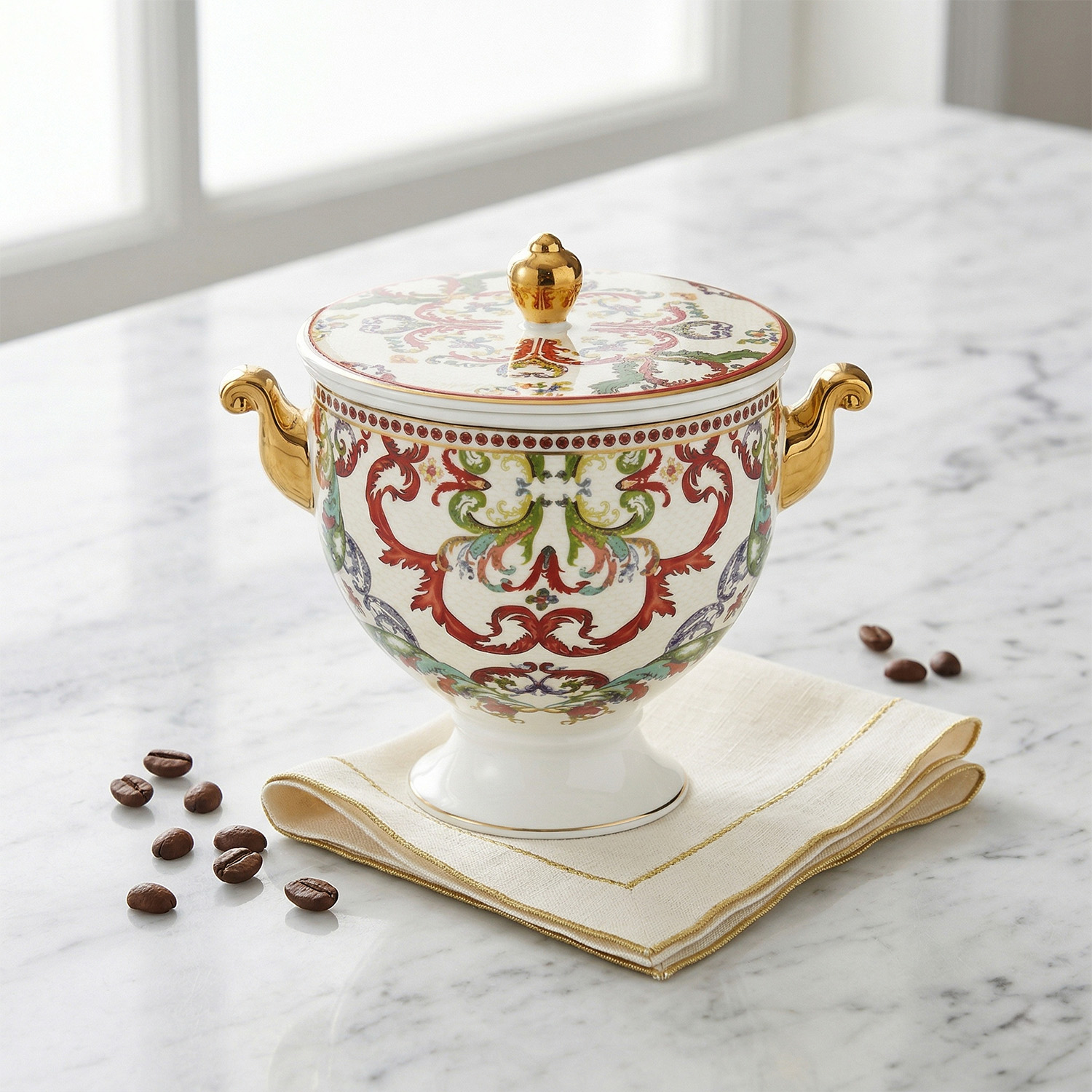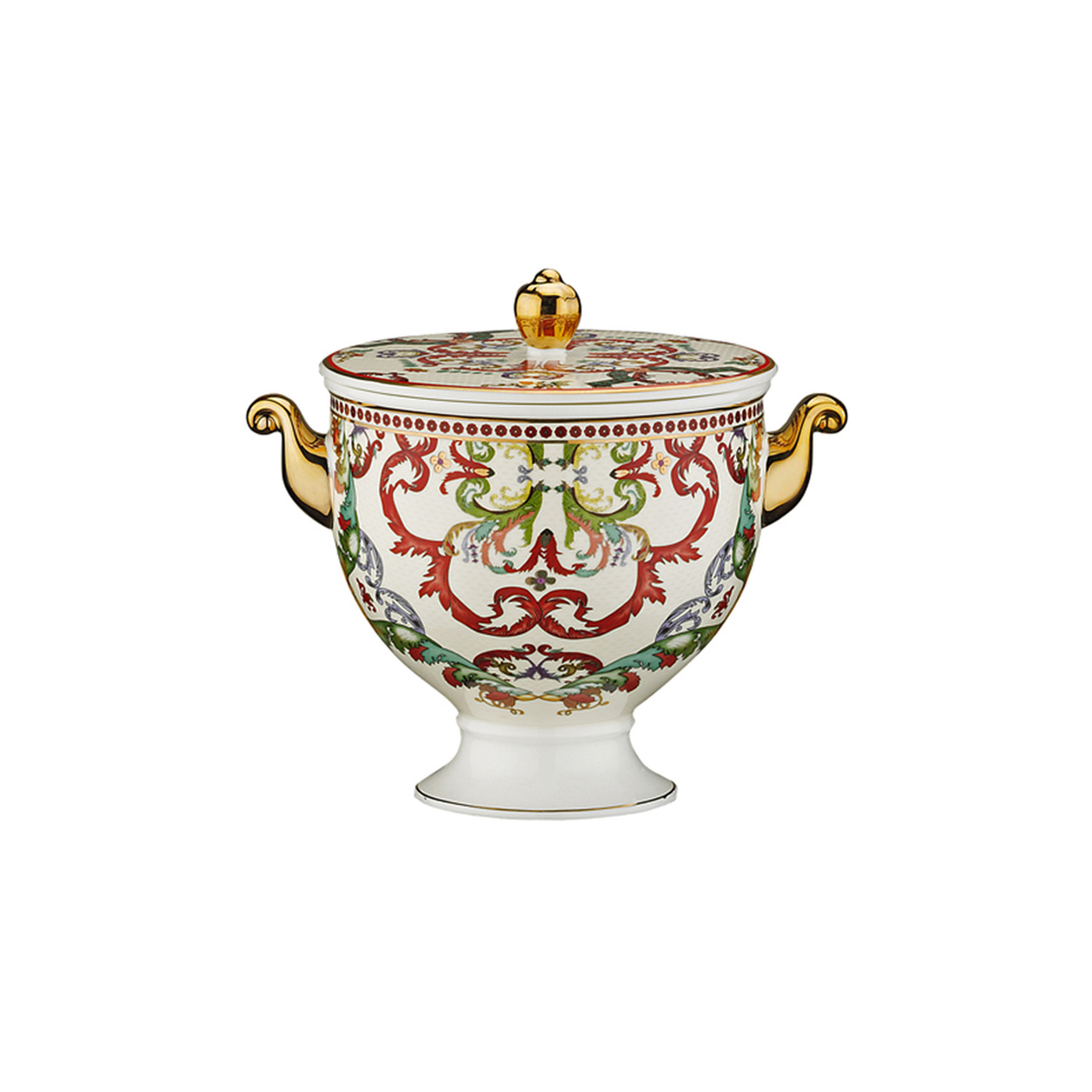Geleneksel Sanat ve Altın Detaylar: Krem zemin üzerine işlenen kiremit kırmızısı, antrasit ve doğa yeşili tonlarındaki mistik motifler; gövdenin iki yanındaki narin altın rengi kulplar ve kapak üzerindeki altın küre kulp ile tamamlanmıştır. Her detay, porselenin doğal beyazlığıyla lüks bir kontrast oluşturur.