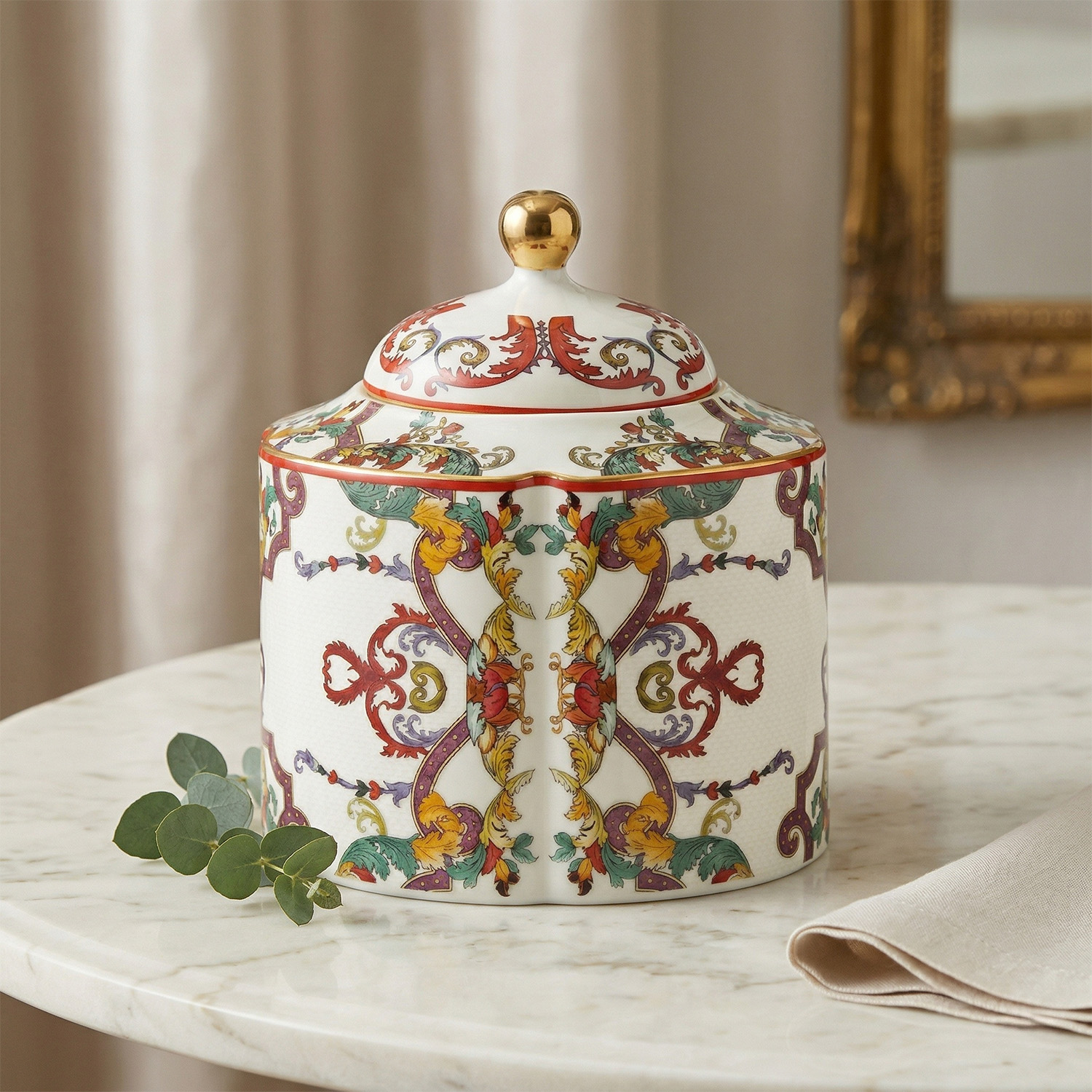 Geleneksel motiflerin büyüleyici enerjisini geniş bir hacimle buluşturun! Velora serisinin antik Rumi ve Hatayi desenlerini porselenin asaletini buluşturan bu 1800 ml’lik dev boy kavanoz, hem prestijli bir saklama alanı hem de raflarınızın en görkemli dekoratif objesi olarak tasarlandı.