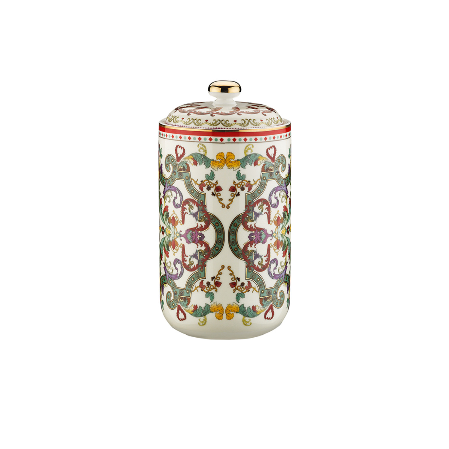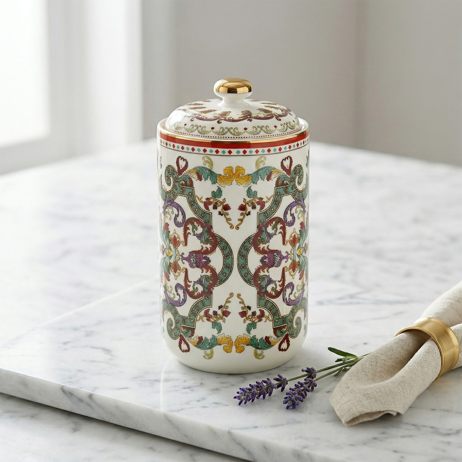 Mistik bir bahçenin zarafetini en yüksek formda keşfedin! Velora serisinin antik Rumi ve Hatayi desenlerini porselenin asaletini buluşturan bu 1200 ml’lik kavanoz, hem prestijli bir saklama alanı hem de mutfağınızın karakterini belirleyen görkemli bir aksesuar olarak tasarlandı.