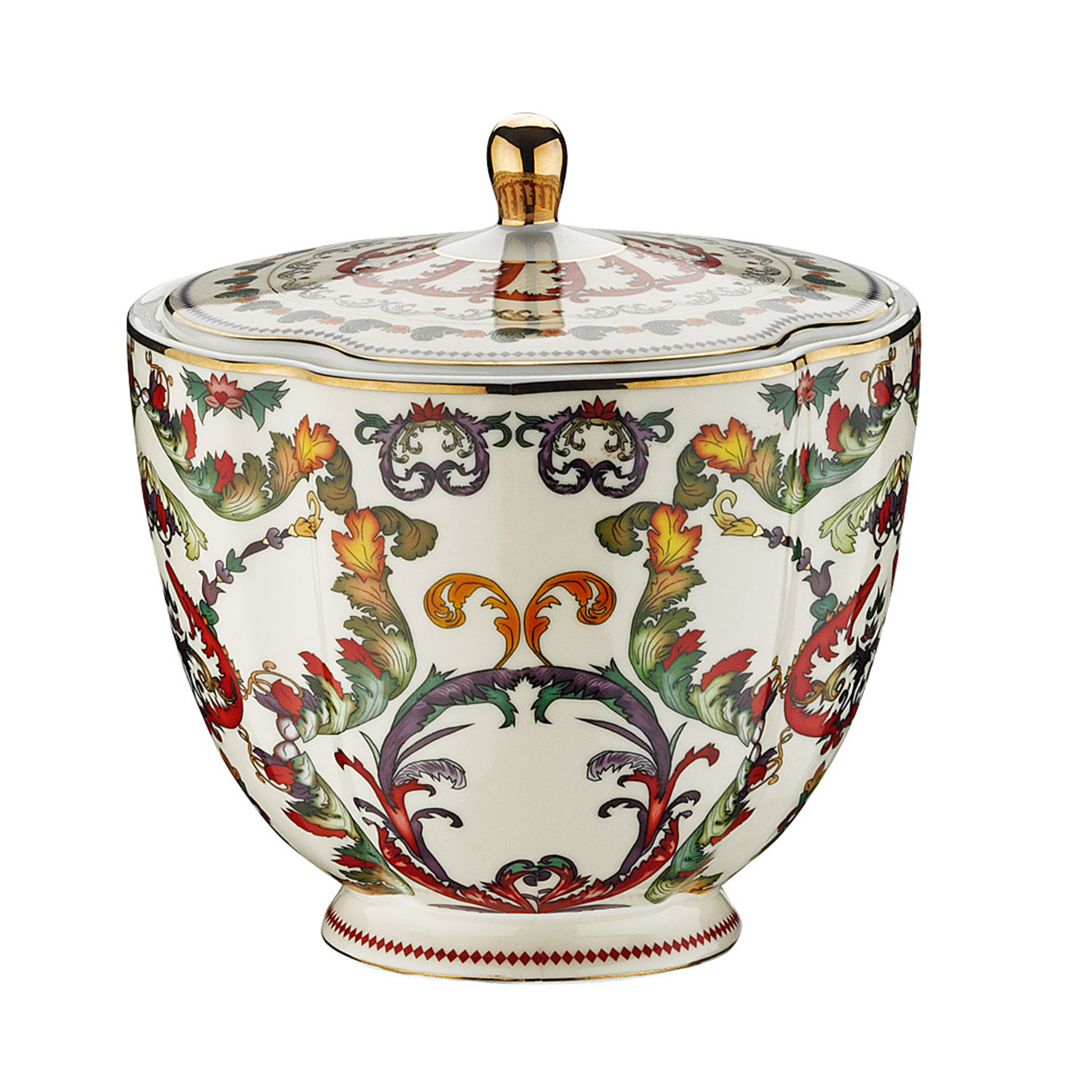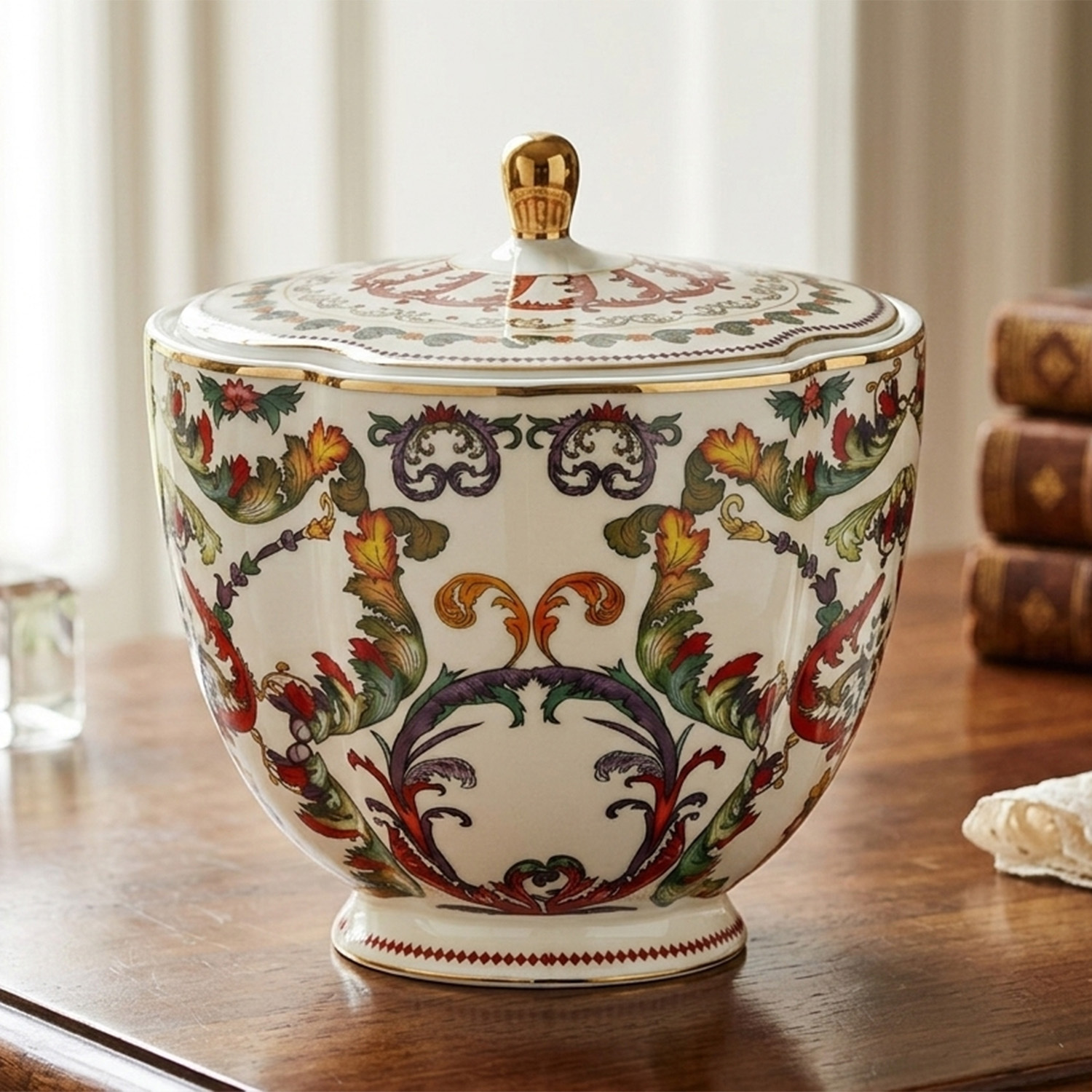 Altın Detaylı Şık Tasarım: Kapak üzerindeki gold (altın rengi) kulp ve kenar yaldızları, karakteristik desenlerle birleşerek masanıza saray şıklığı getirir.